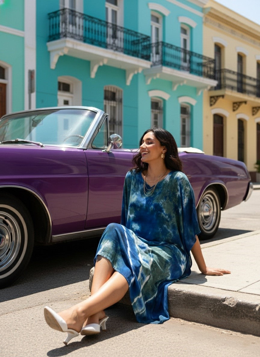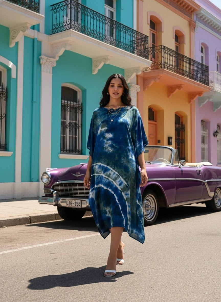 Women Rayon Crepe Tie & Dye Blue Kaftan Dress (W1209)