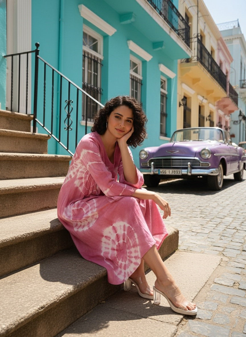 Experience timeless elegance with this handmade pink dress, blending comfort and style effortlessly. The delicate floral print on a soft rayon fabric offers breathability, while the flared silhouette ensures a flattering fit. Perfect for casual, festive, or semi-formal occasions, it pairs easily with leggings, palazzos, or jeans. Designed for convenience, it’s machine-washable and retains its vibrant color and print long-term.