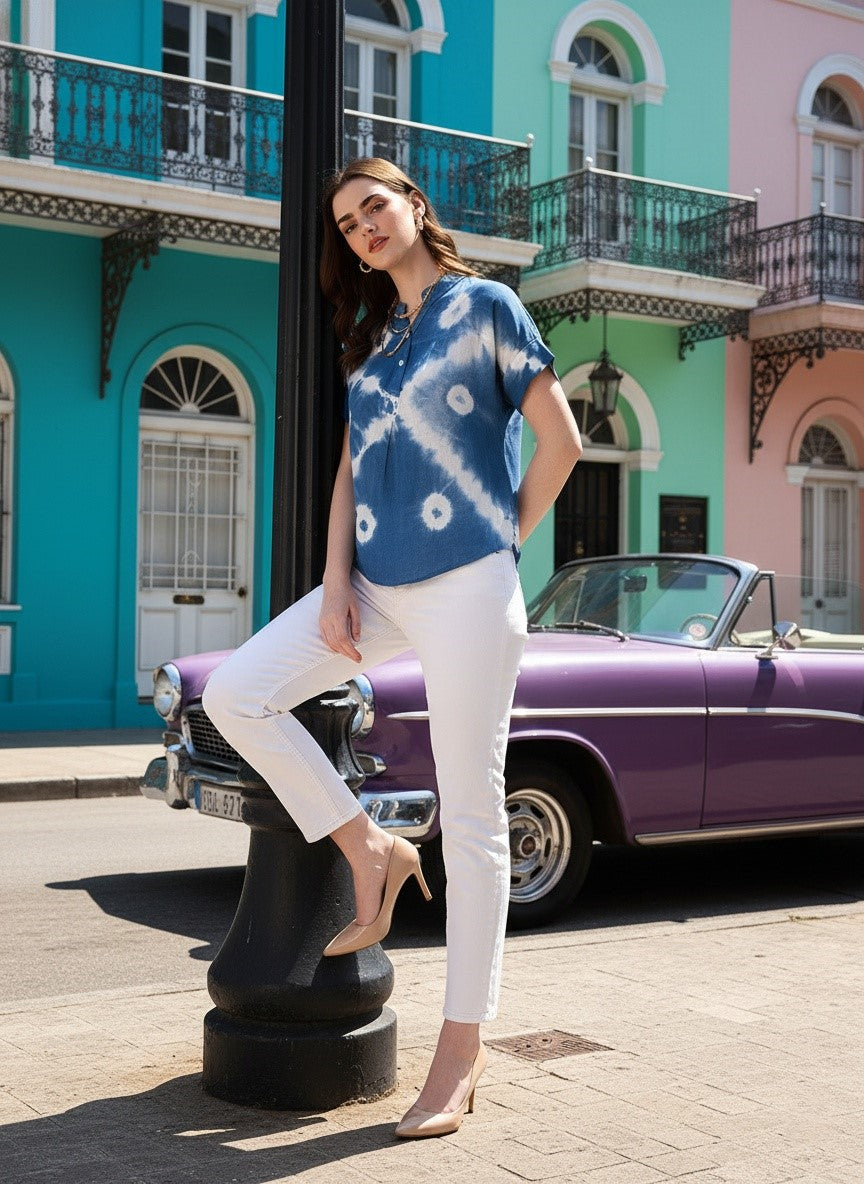 Introducing the Vibrant Blue Tie-Dye Everywhere Top – a stunning addition to your wardrobe designed to elevate your everyday style with a burst of color and comfort. Crafted from soft rayon fabric, this top features a bold blue tie-dye pattern that radiates energy and modern chic. Perfect for casual outings or laid-back occasions, it combines the beauty of contemporary fashion with the ease of casual wear. This versatile piece from Jaipur Hues is a must-have to add vibrant flair to your wardrobe this season.