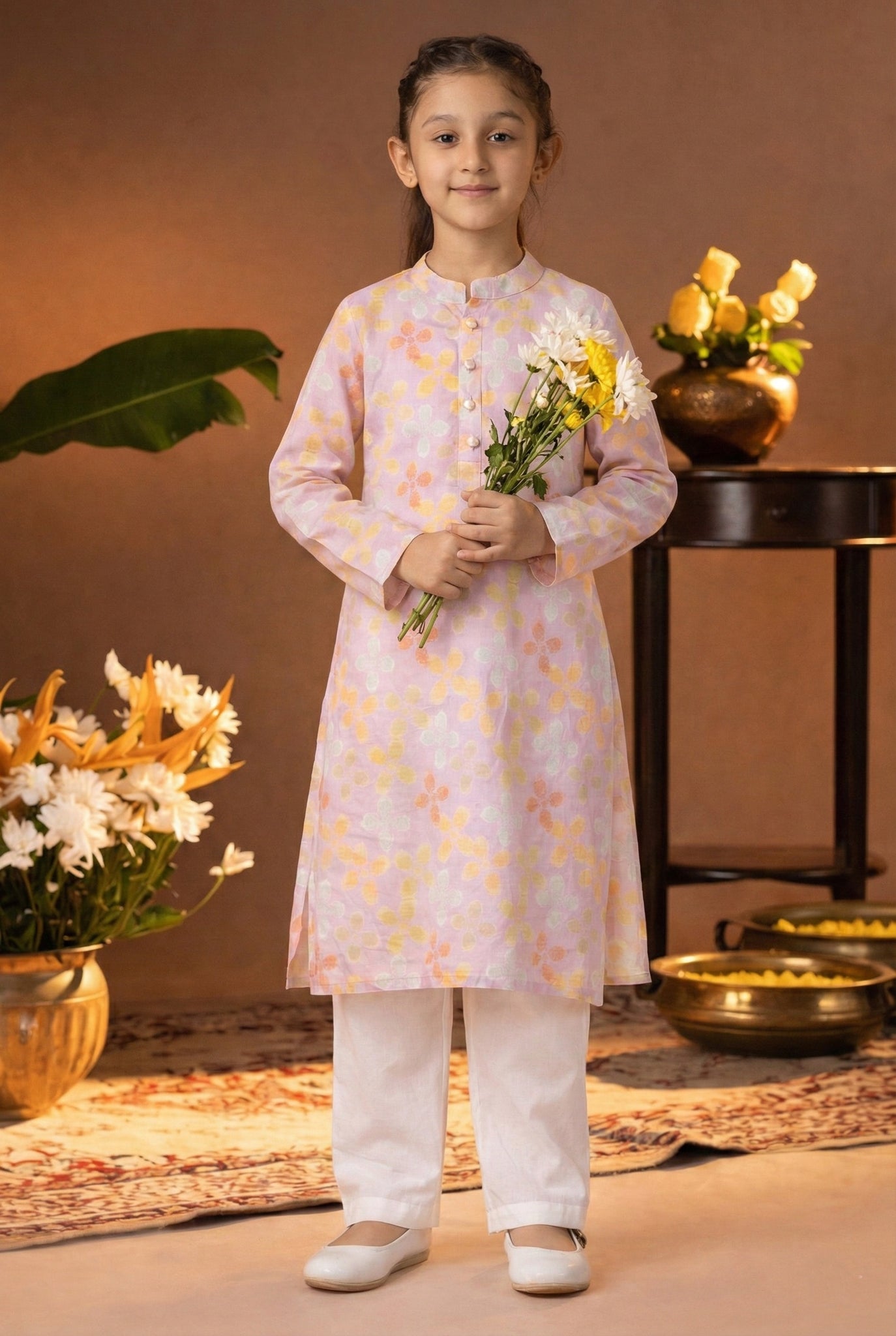 Classic Girls cotton kurta pyjama set, designed for comfort and style. This traditional outfit features a soft, breathable kurta paired with matching pyjama pants, perfect for festive occasions, family gatherings, or casual wear.