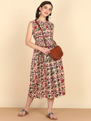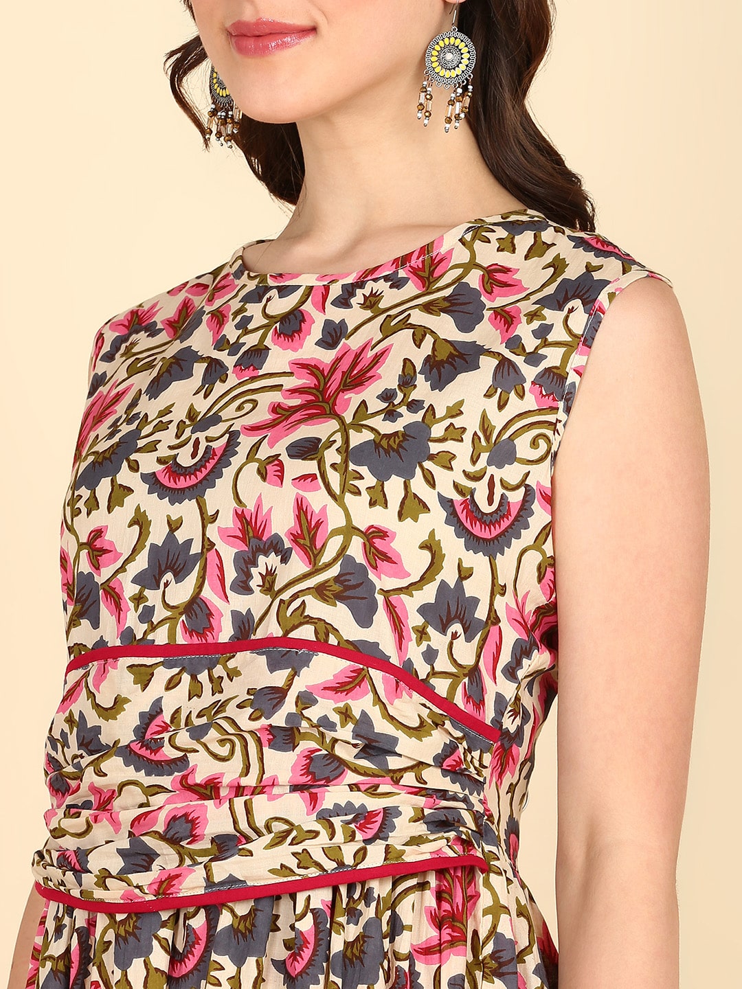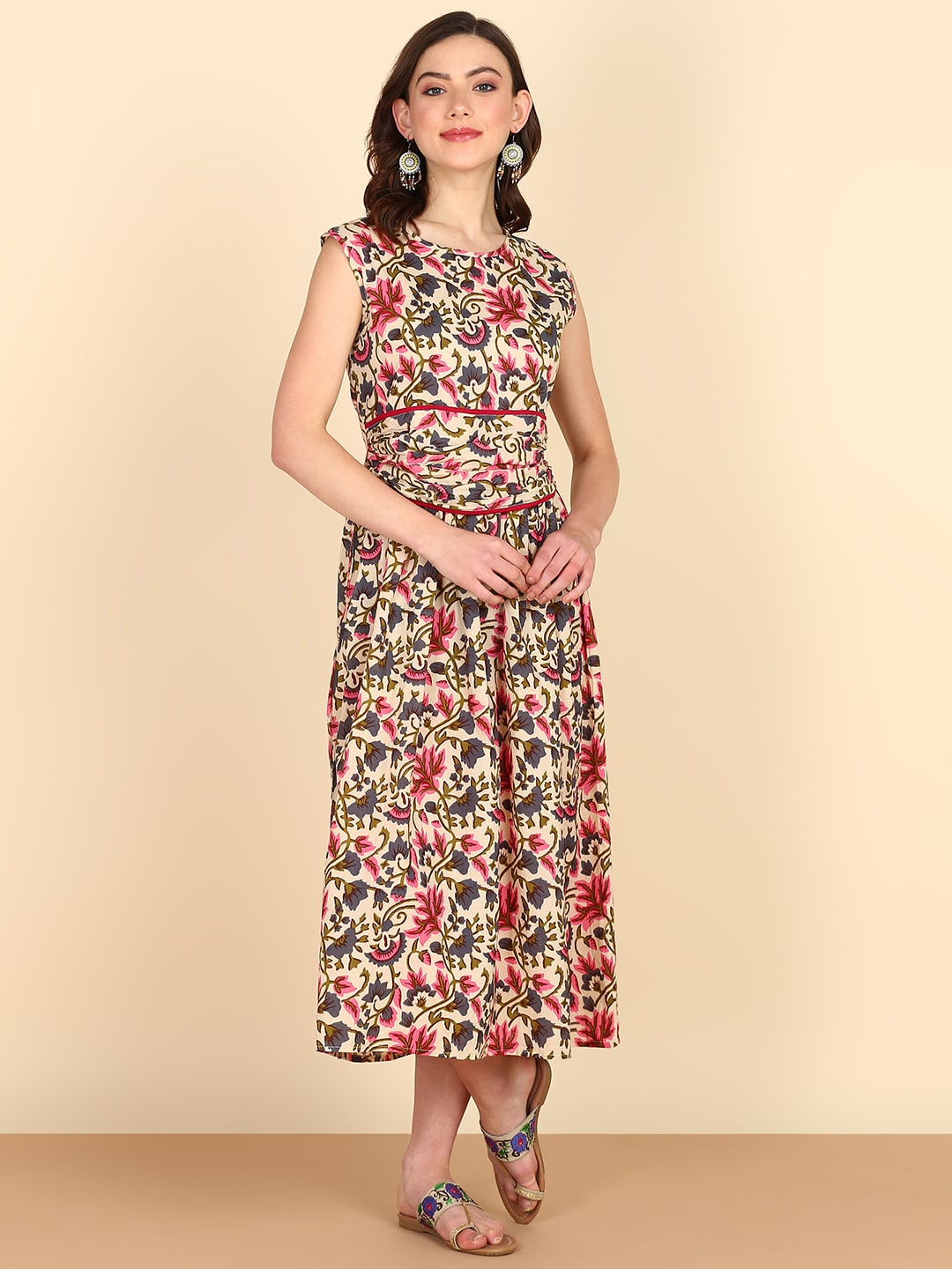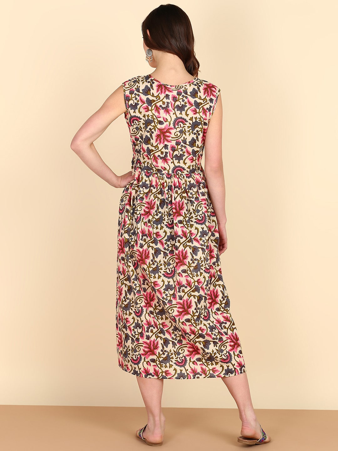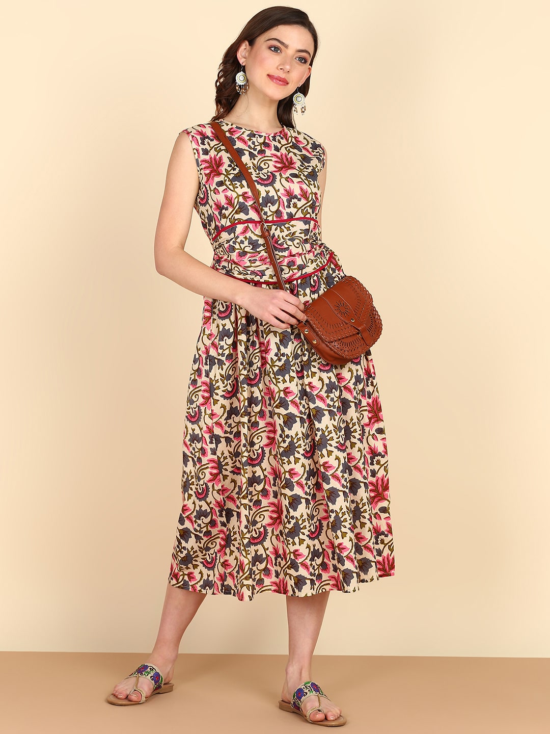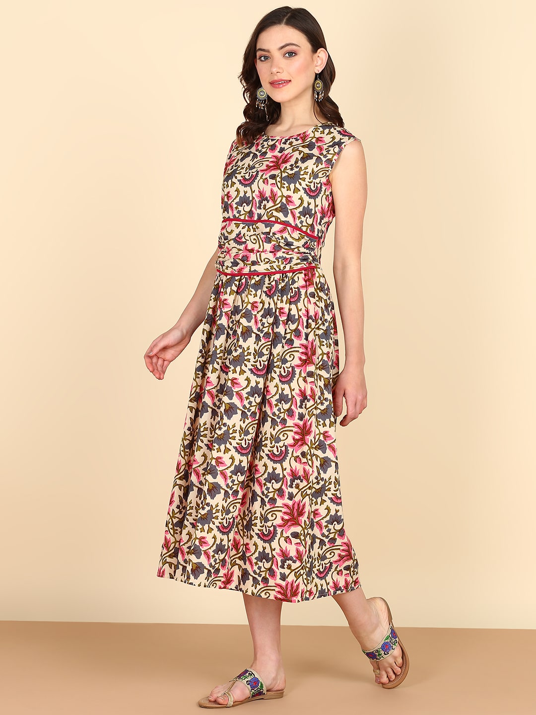Pure Cotton Floral Printed Beige A-line Midi Dress (W1226)