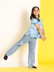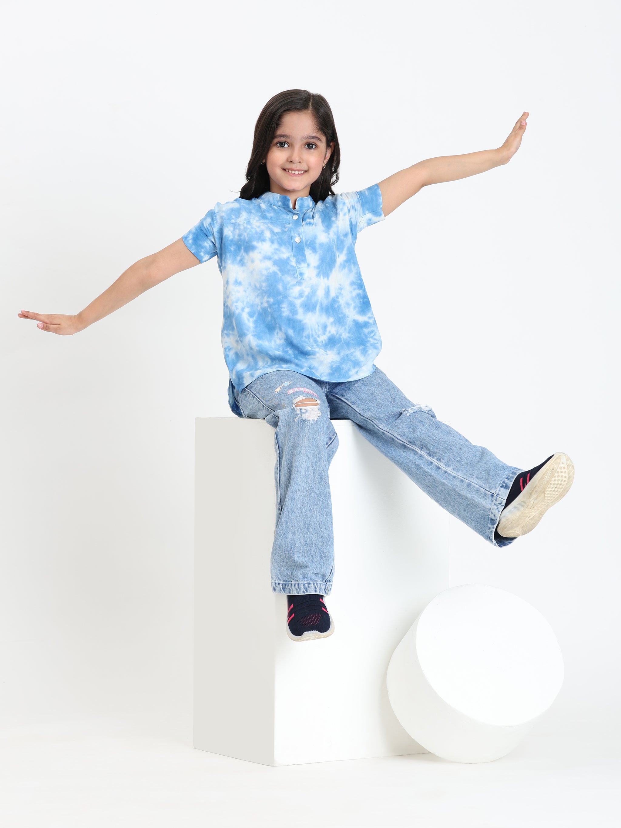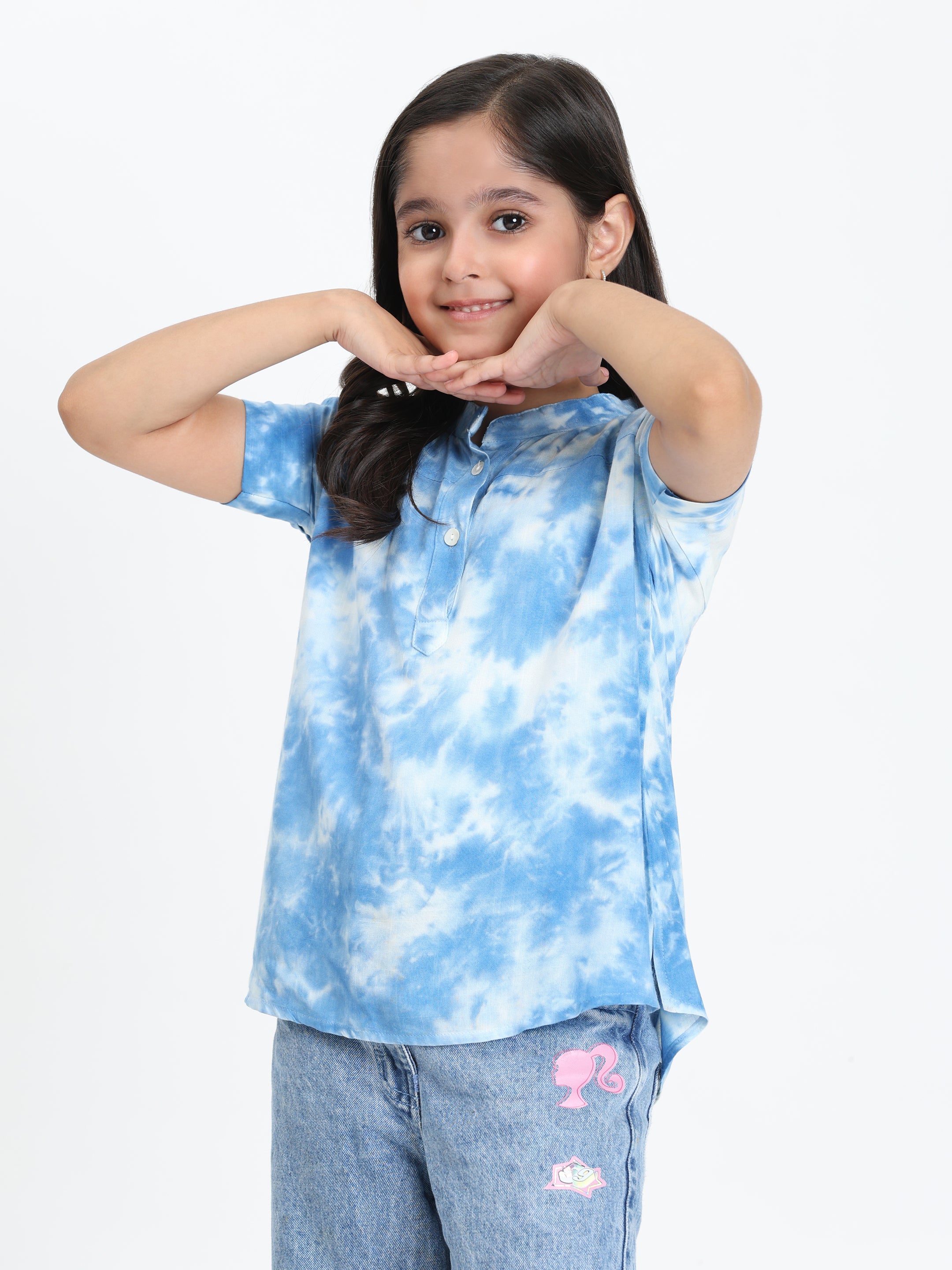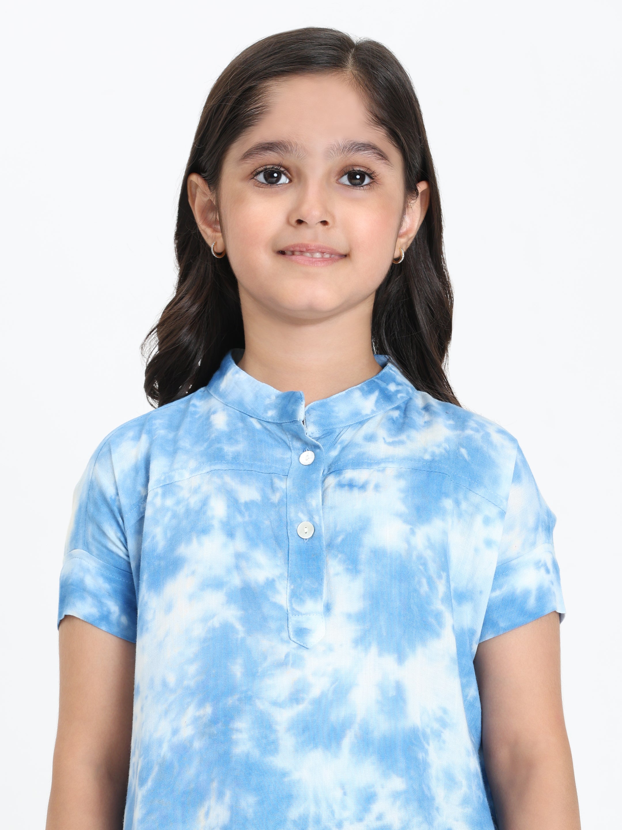 Light Blue Ombre Tie & Dye Mandarin Collar Rayon Slub Top For Girls (K11065)