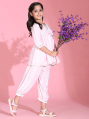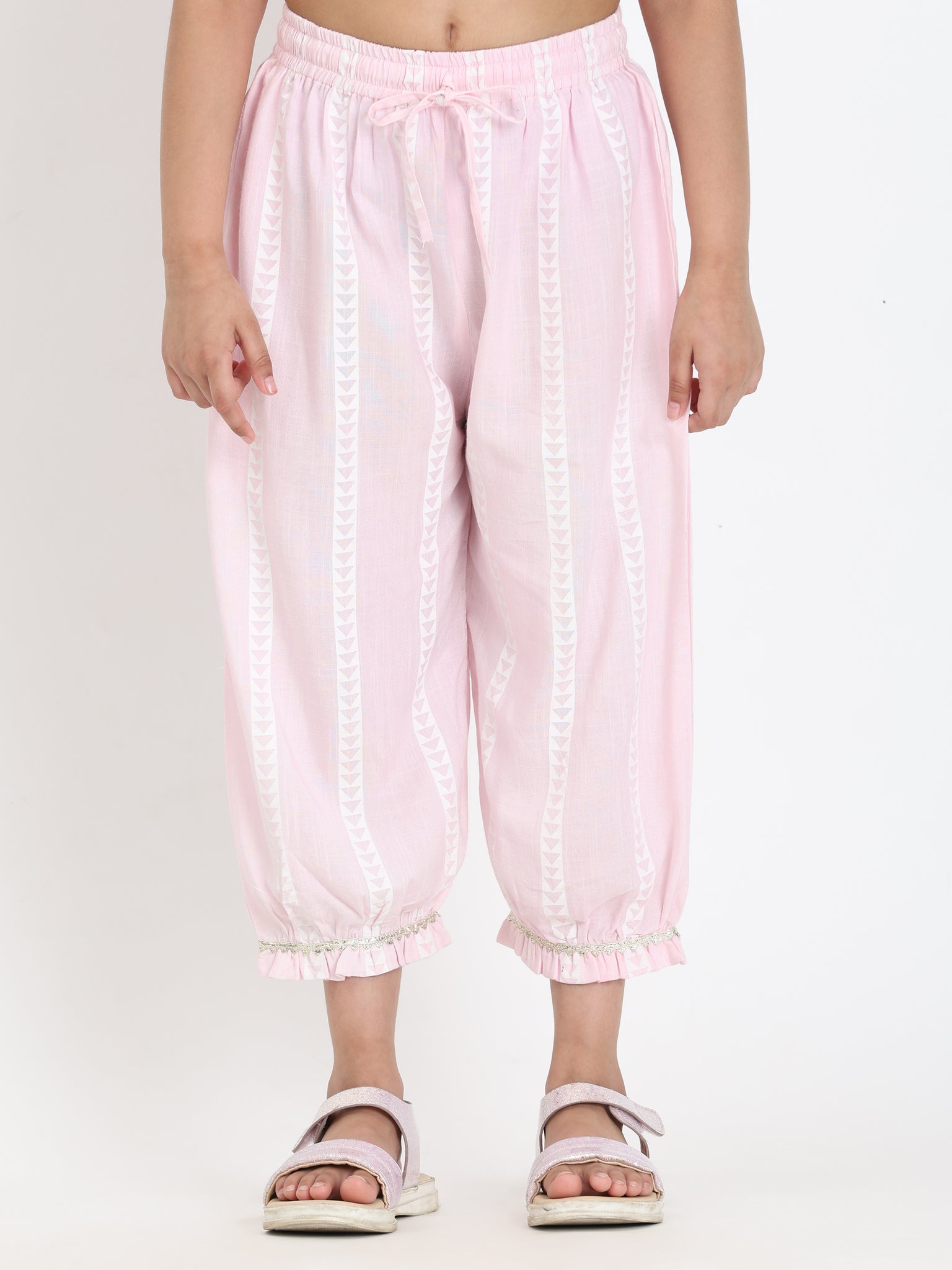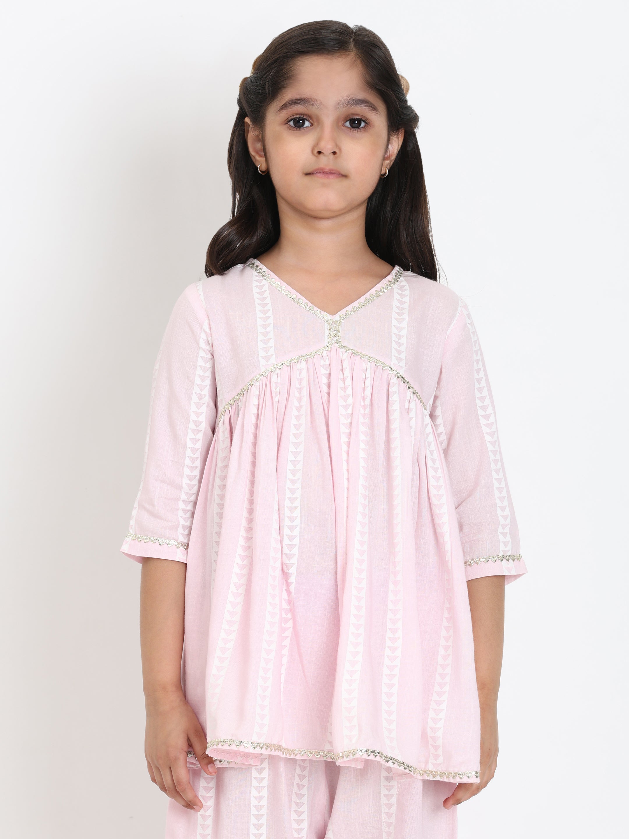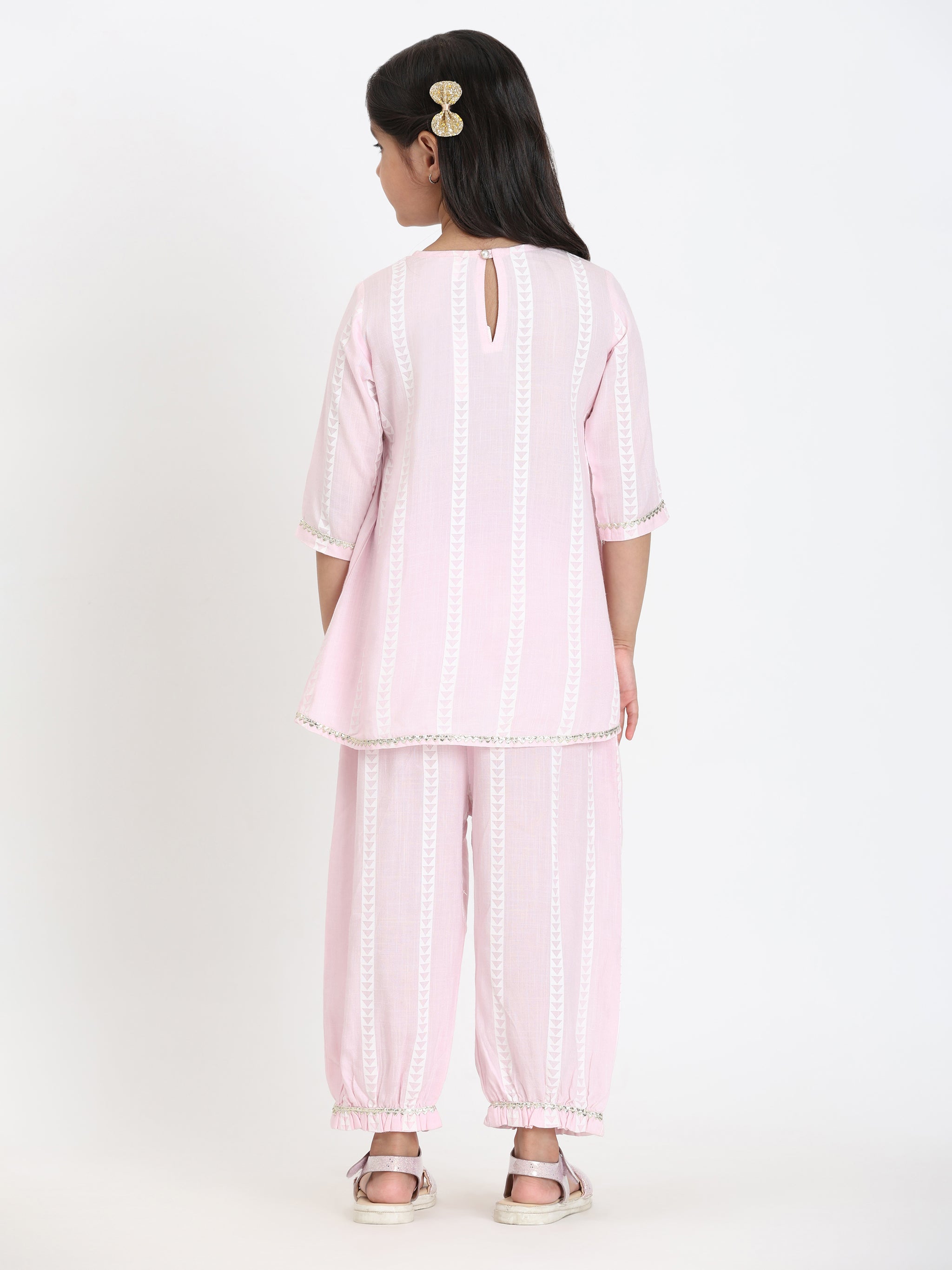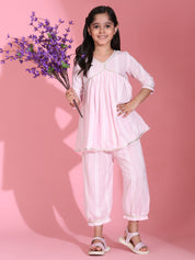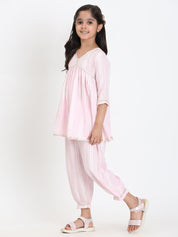 Girls Light Pink & White Striped Cotton Alia Kurta and Afghani Pants Set (K11073)