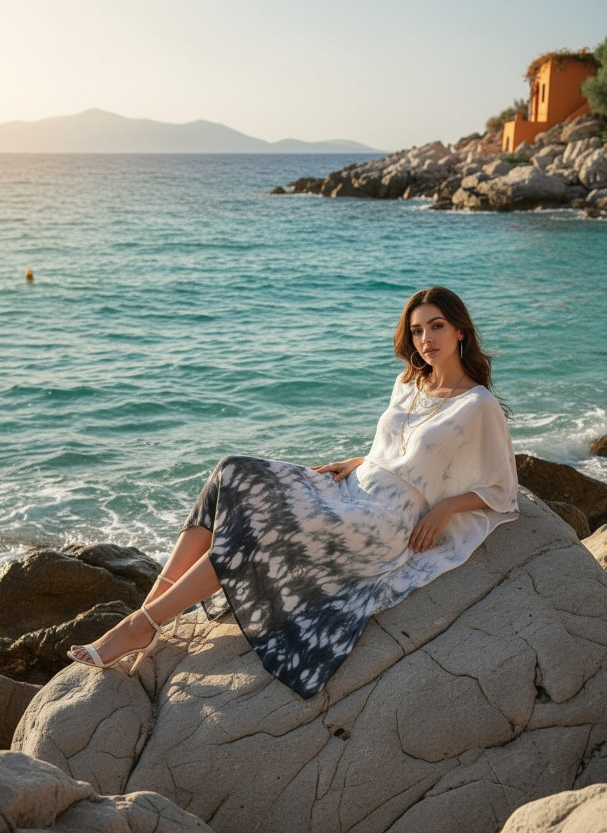Immerse yourself in the art of tie-and-dye, a technique where fabric is intricately folded, pleated, tied, or stitched to achieve diverse designs. In India, this craft manifests as leheriya, shibori, and bandhani, each telling a unique story. Elevate your style effortlessly with our hand-dyed kaftan kurtas, seamlessly blending handcrafting allure with a relaxed fit. Perfect for any occasion, embrace the simplicity of luxurious fashion and the timeless elegance of meticulous craftsmanship.