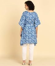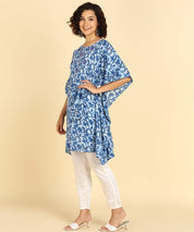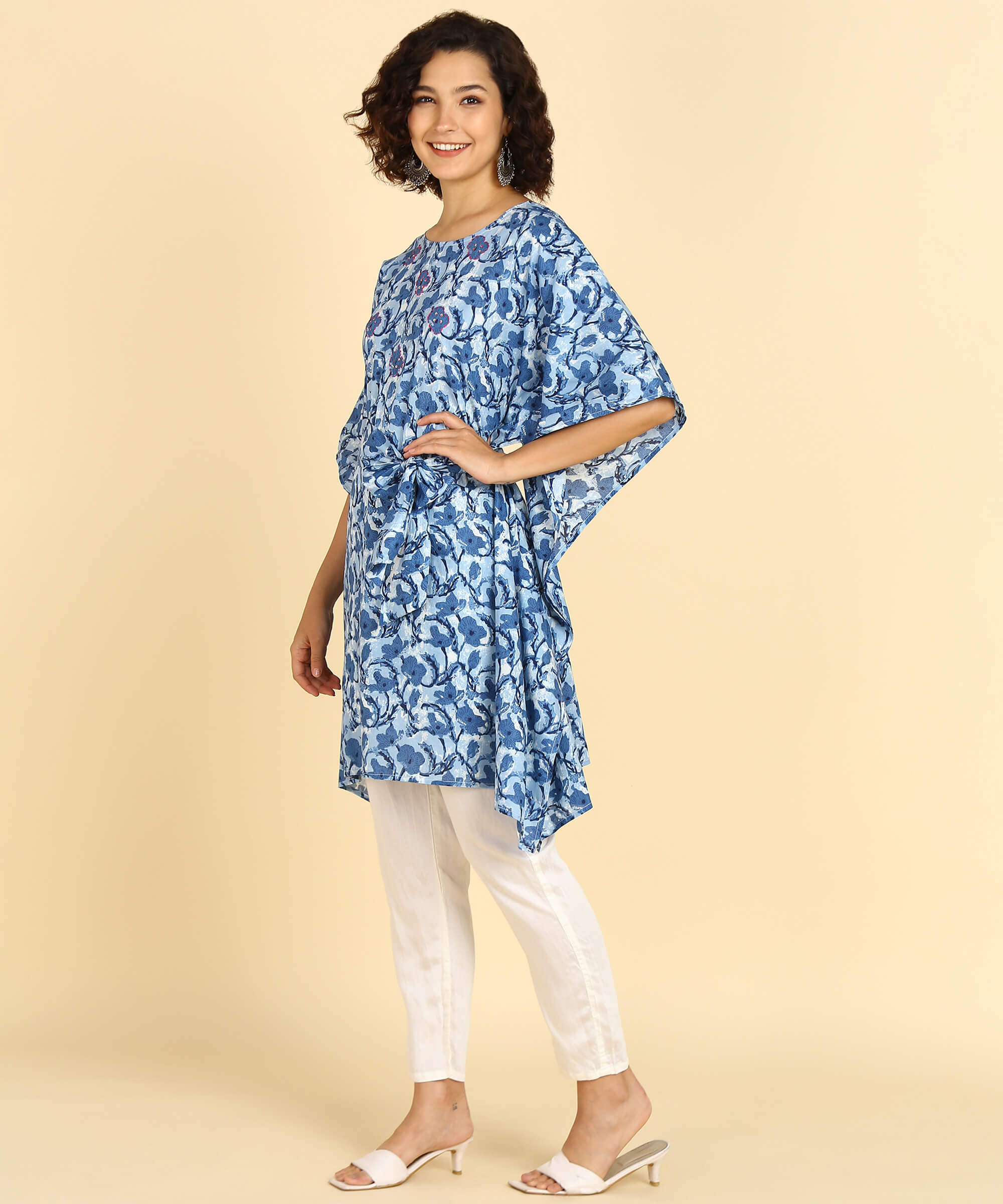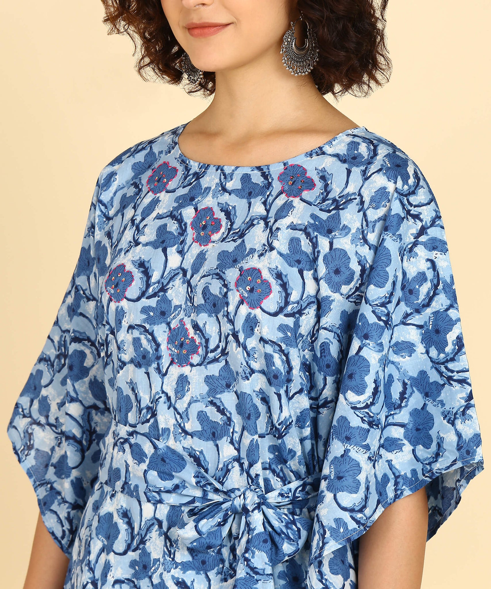 Pure Cotton Blue Printed Kaftan Tunic With Hand Kantha Work (W1397)