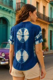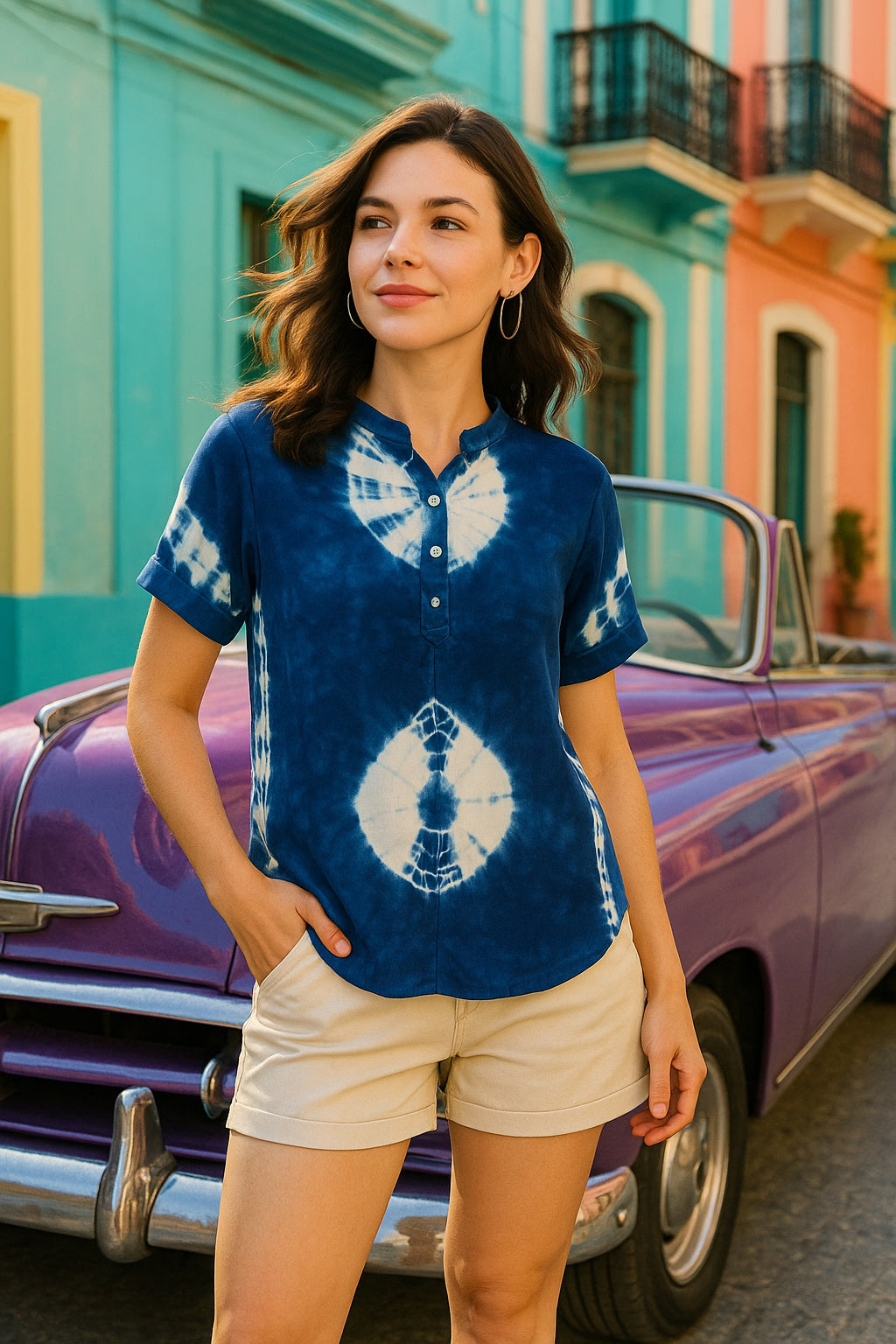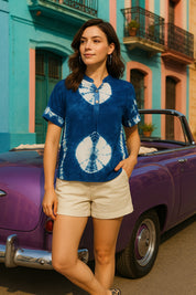 Immerse yourself in the art of tie-and-dye, a technique where fabric is intricately folded, pleated, tied, or stitched to achieve diverse designs. In India, this craft manifests as leheriya, shibori, and bandhani, each telling a unique story. Elevate your style effortlessly with our hand-dyed mandarin collar rayon tops, seamlessly blending handcrafting allure with a modern fit. Perfect for any occasion, embrace the simplicity of luxurious fashion and the timeless elegance of meticulous craftsmanship.