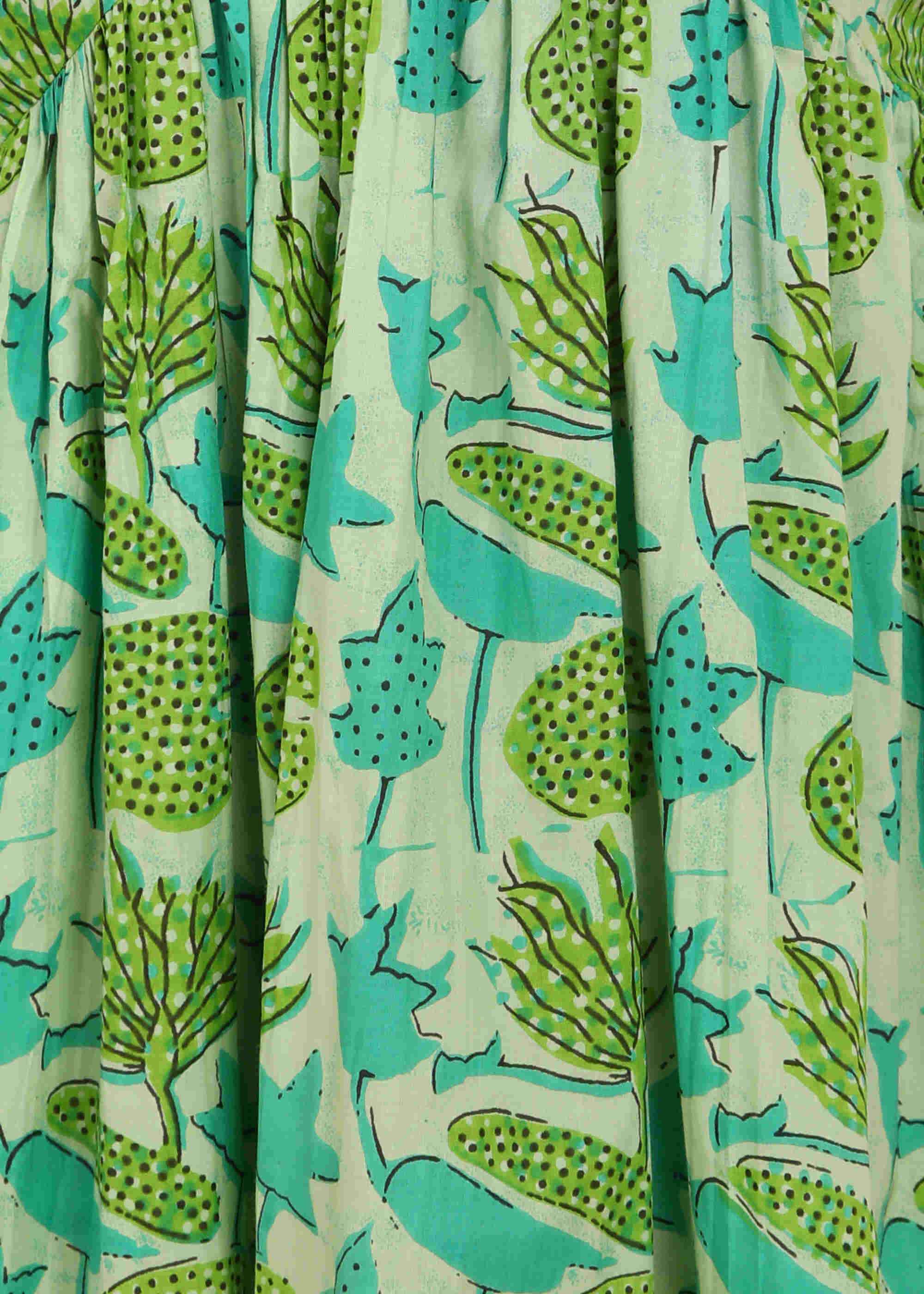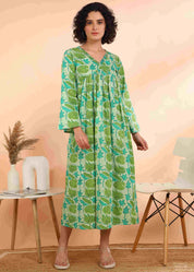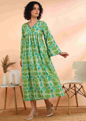 Women Handmade Floral Print Cotton Blend Flared Light green Dress (W1612)