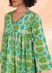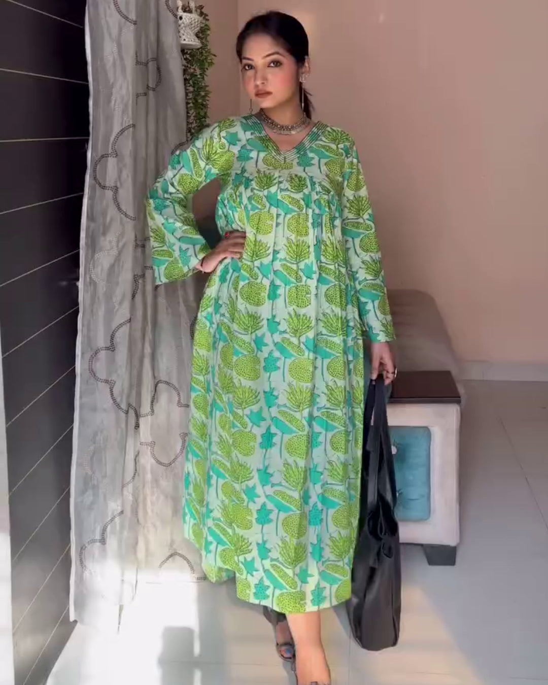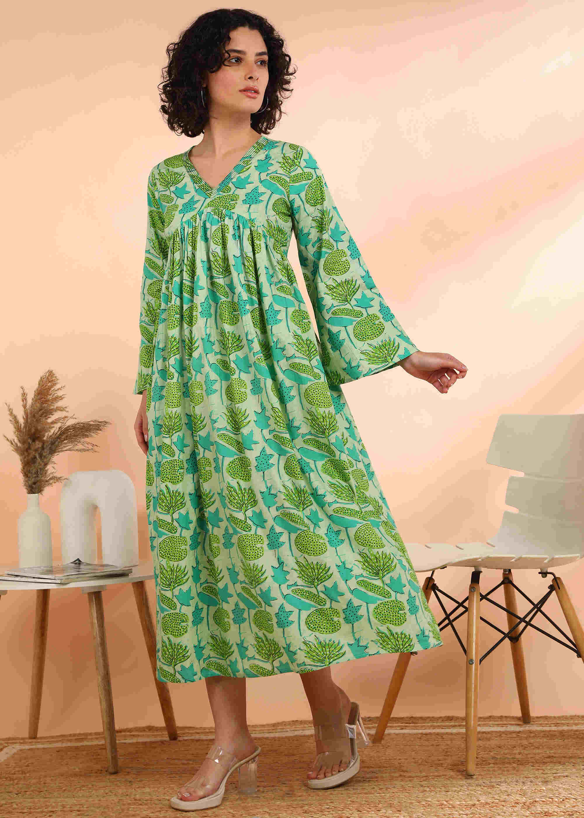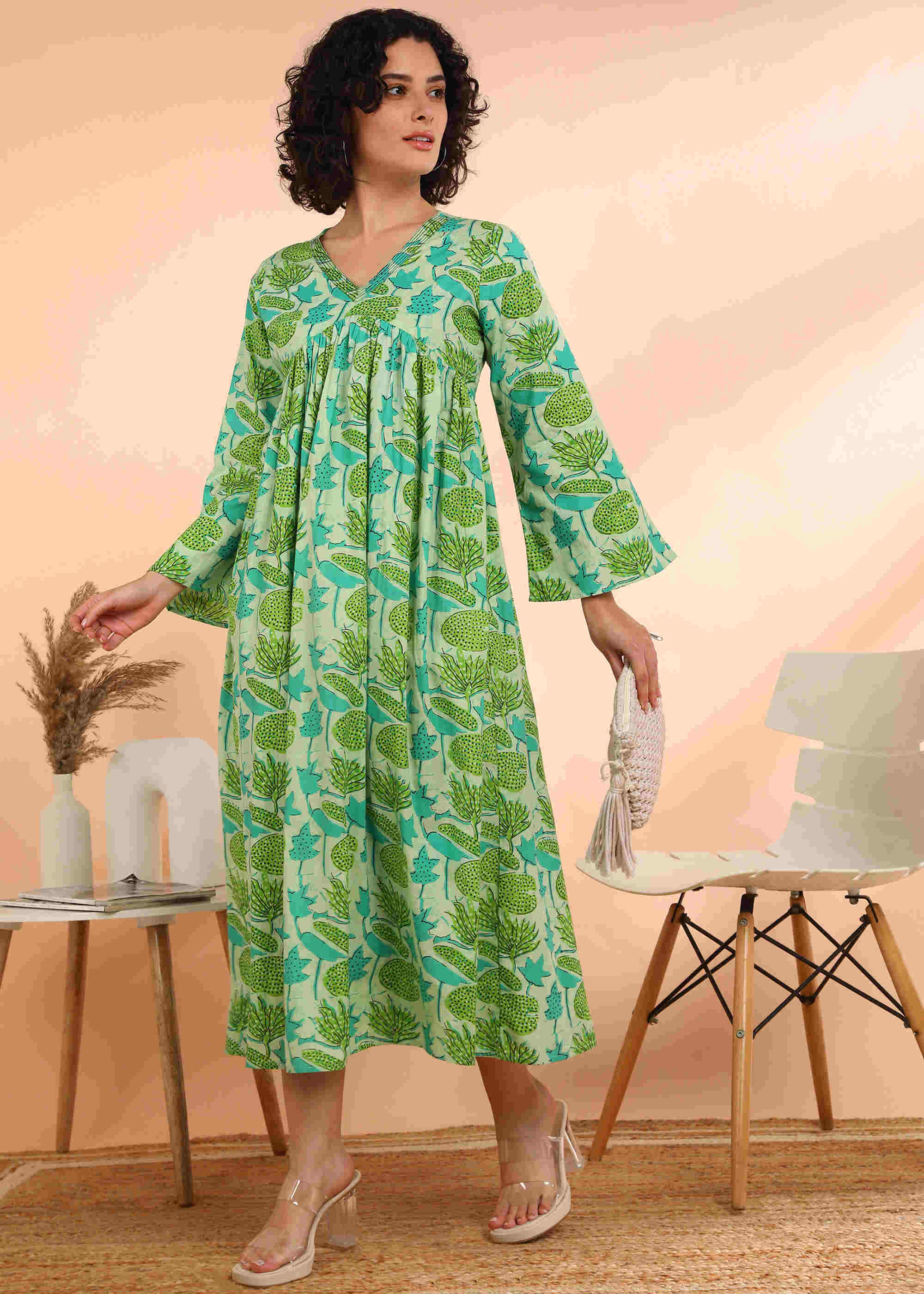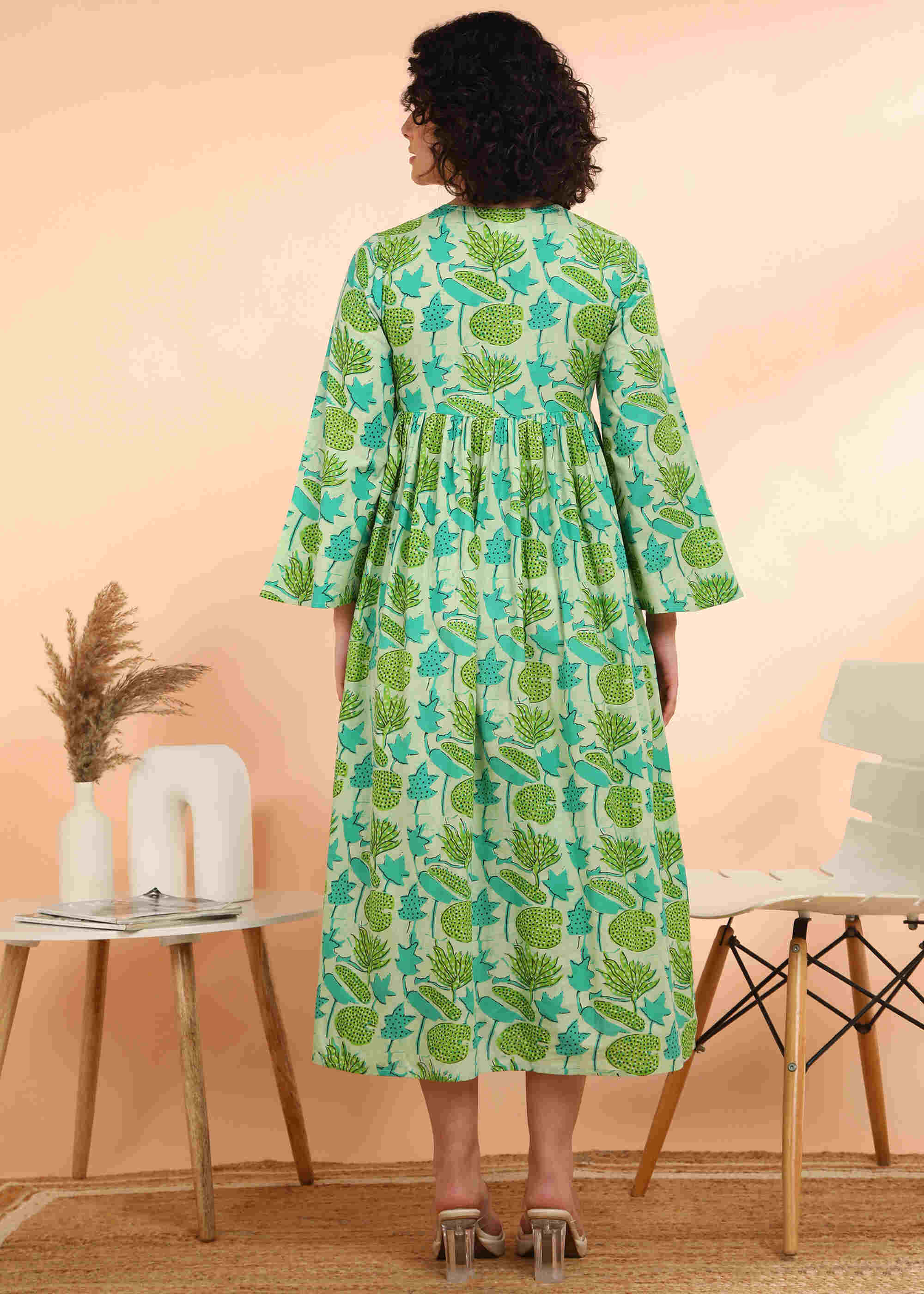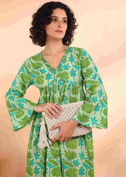 Experience timeless elegance with this handmade light green dress, blending comfort and style effortlessly. The delicate floral print on a soft cotton blend fabric offers breathability, while the flared silhouette ensures a flattering fit. Perfect for casual, festive, or semi-formal occasions, it pairs easily with leggings, palazzos, or jeans. Designed for convenience, it’s machine-washable and retains its vibrant color and print long-term.