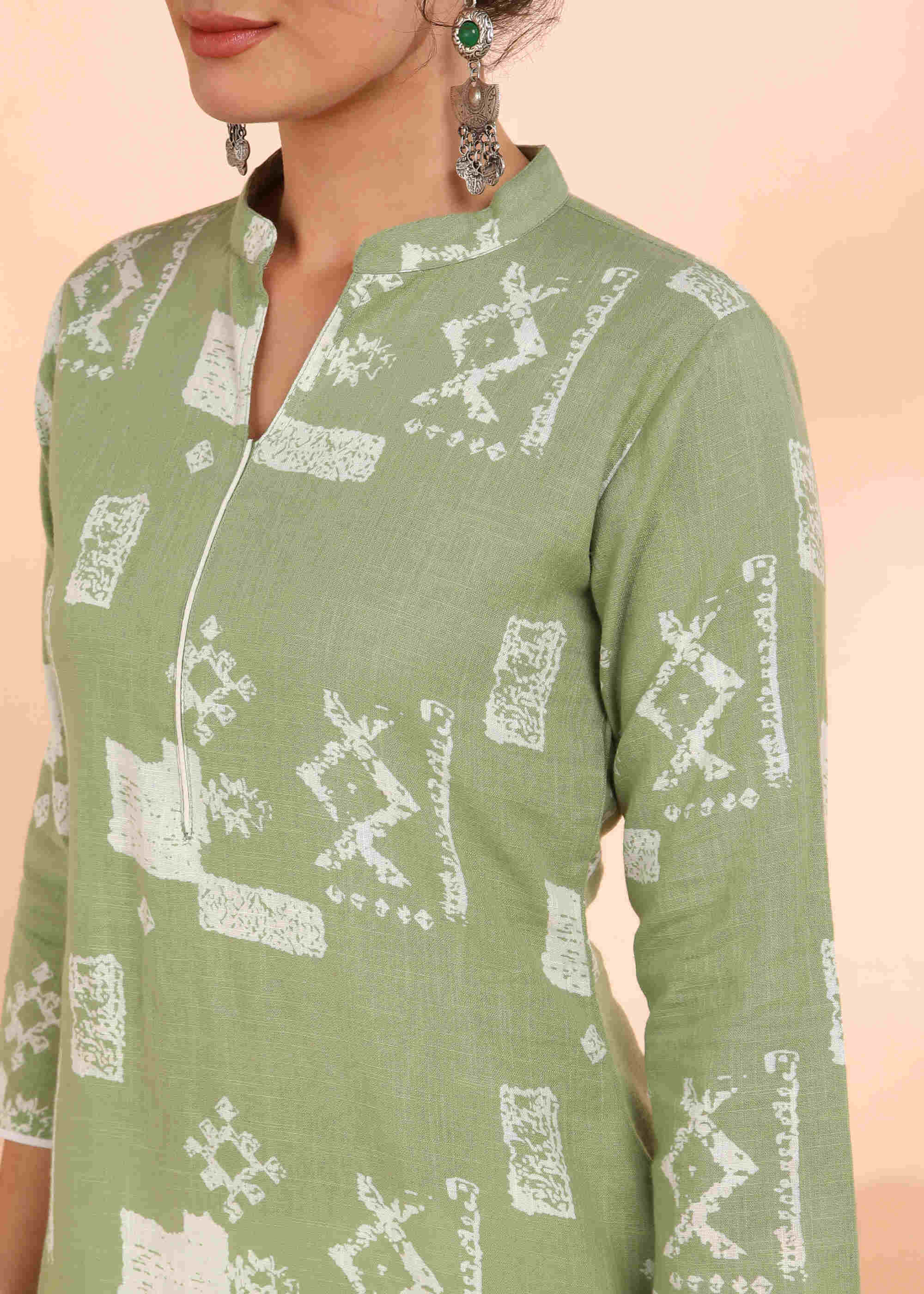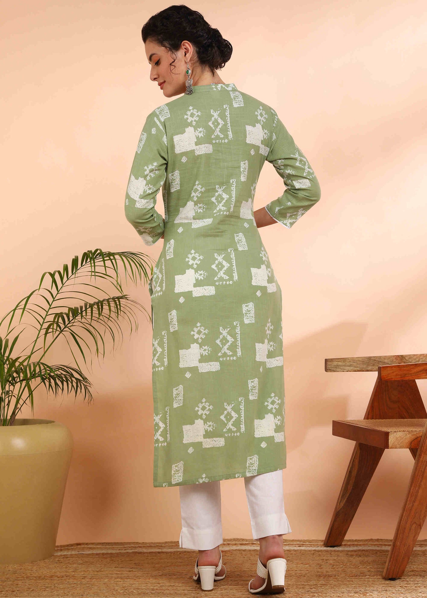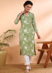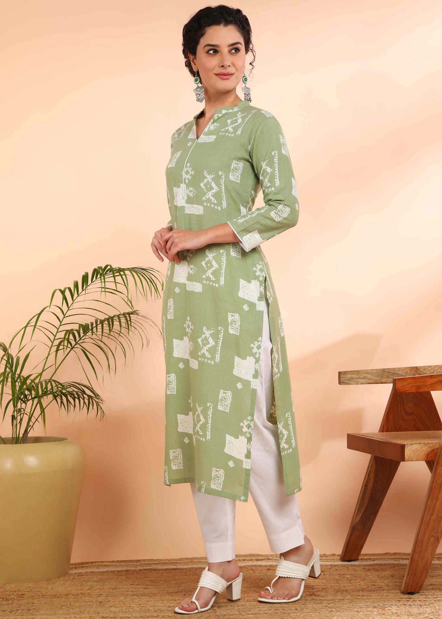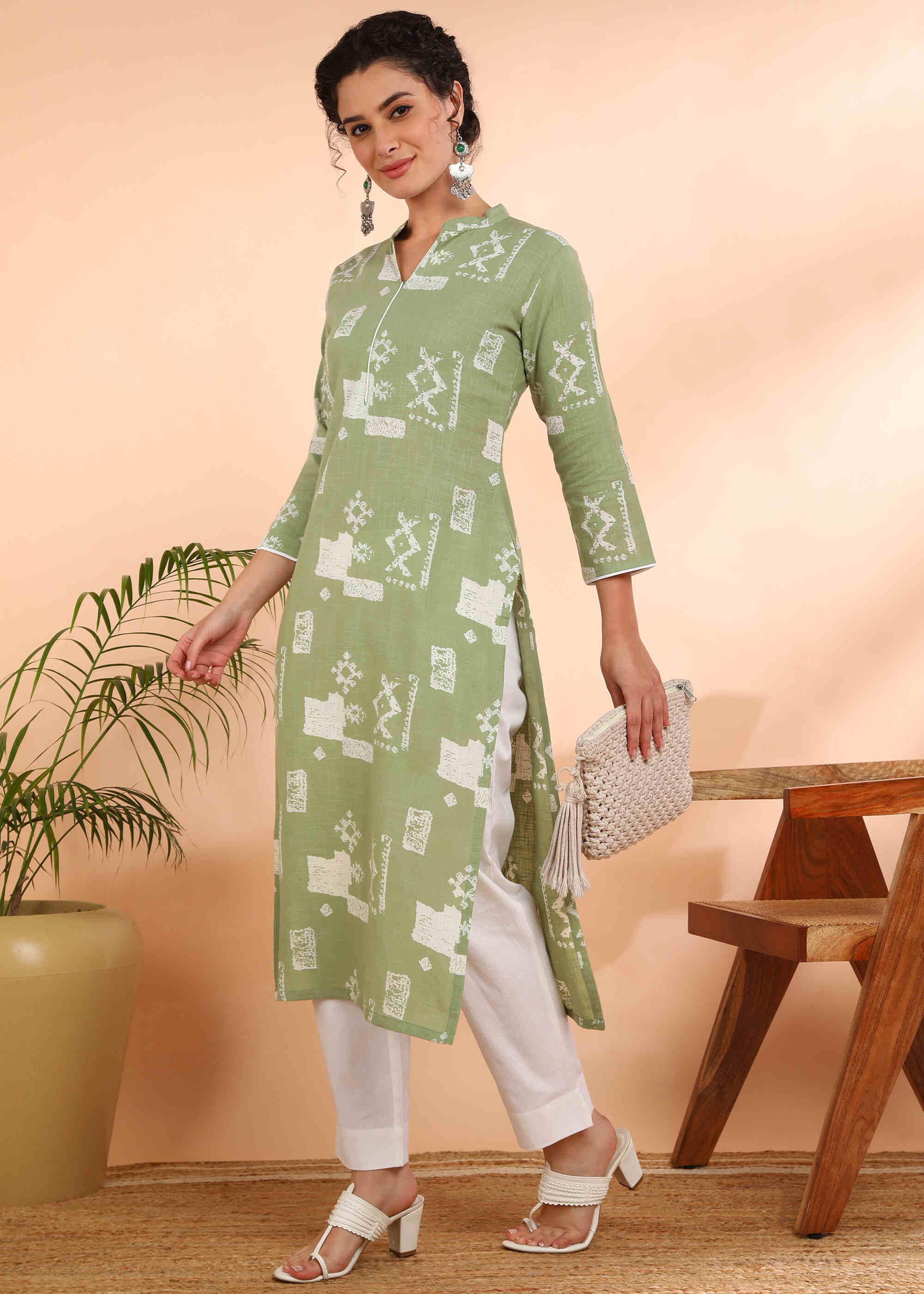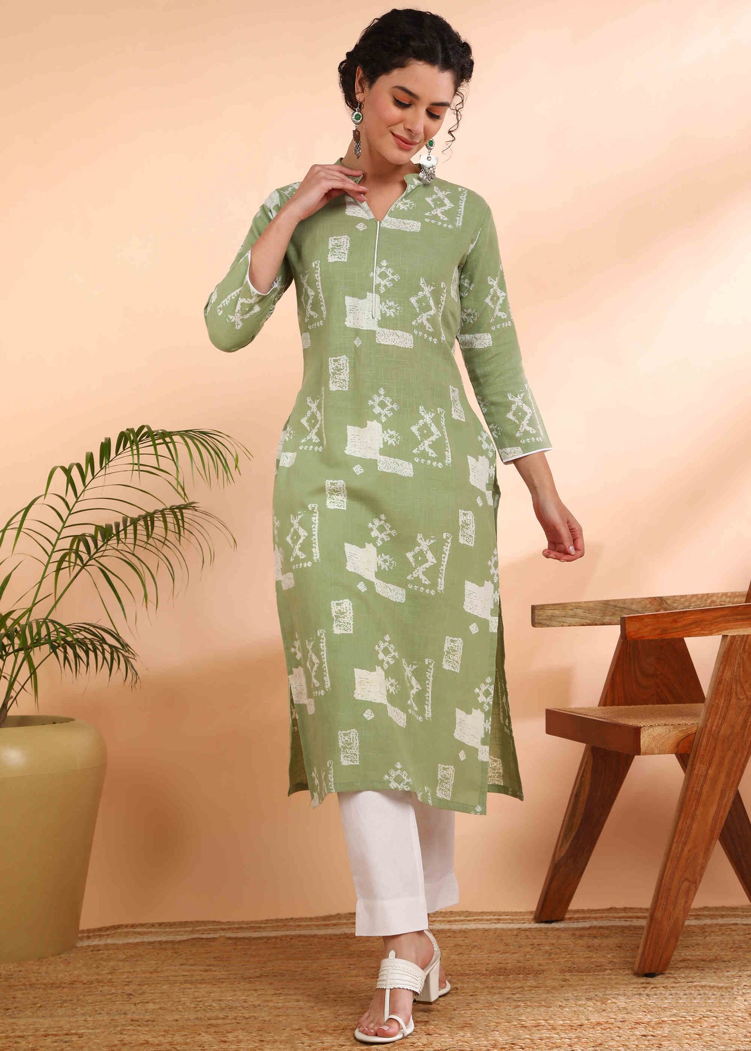 Women Handmade Geometric Pure Cotton Straight Green Kurta (W1585)
