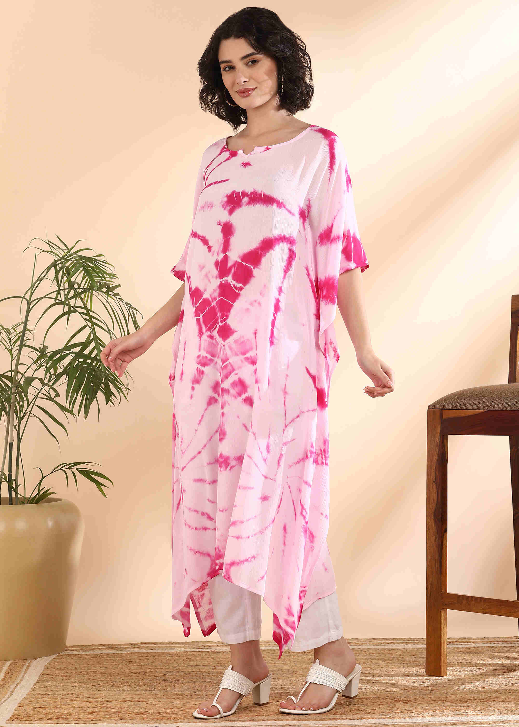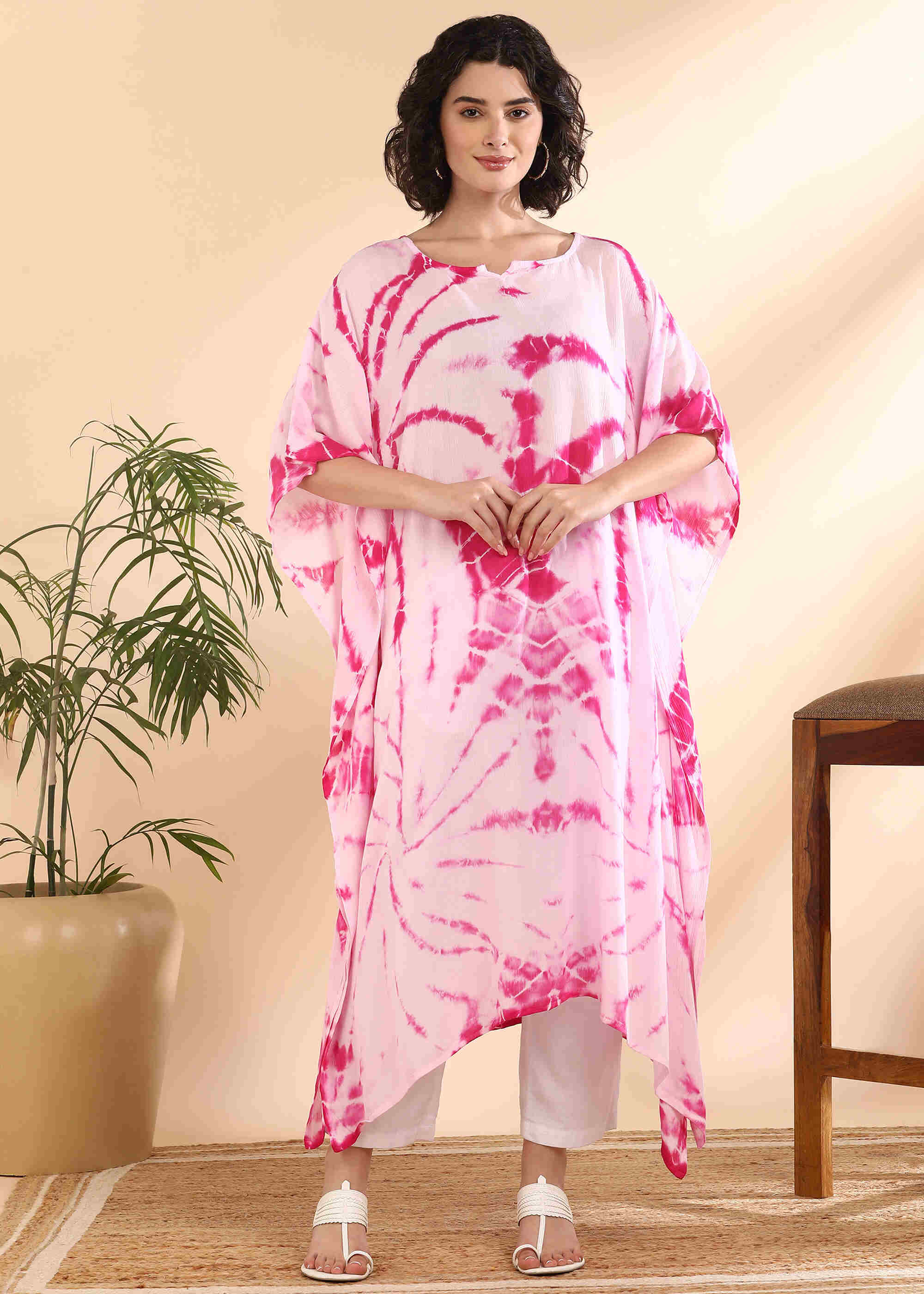 The Women Handmade Tie-Dye Rayon Crepe Pink White Kaftan Kurta in pink combines vibrant color with a touch of elegance. Crafted from soft, breathable rayon crepe fabric, this lightweight Kaftan Kurta features a trendy tie-dye pattern, giving it a chic, boho vibe. With its relaxed fit and luxurious feel, it pairs perfectly with jeans, skirts, or shorts for a casual yet stylish look. Ideal for everyday wear, this pink tie-dye crepe Kaftan Kurta adds a pop of color and effortless charm to your wardrobe.