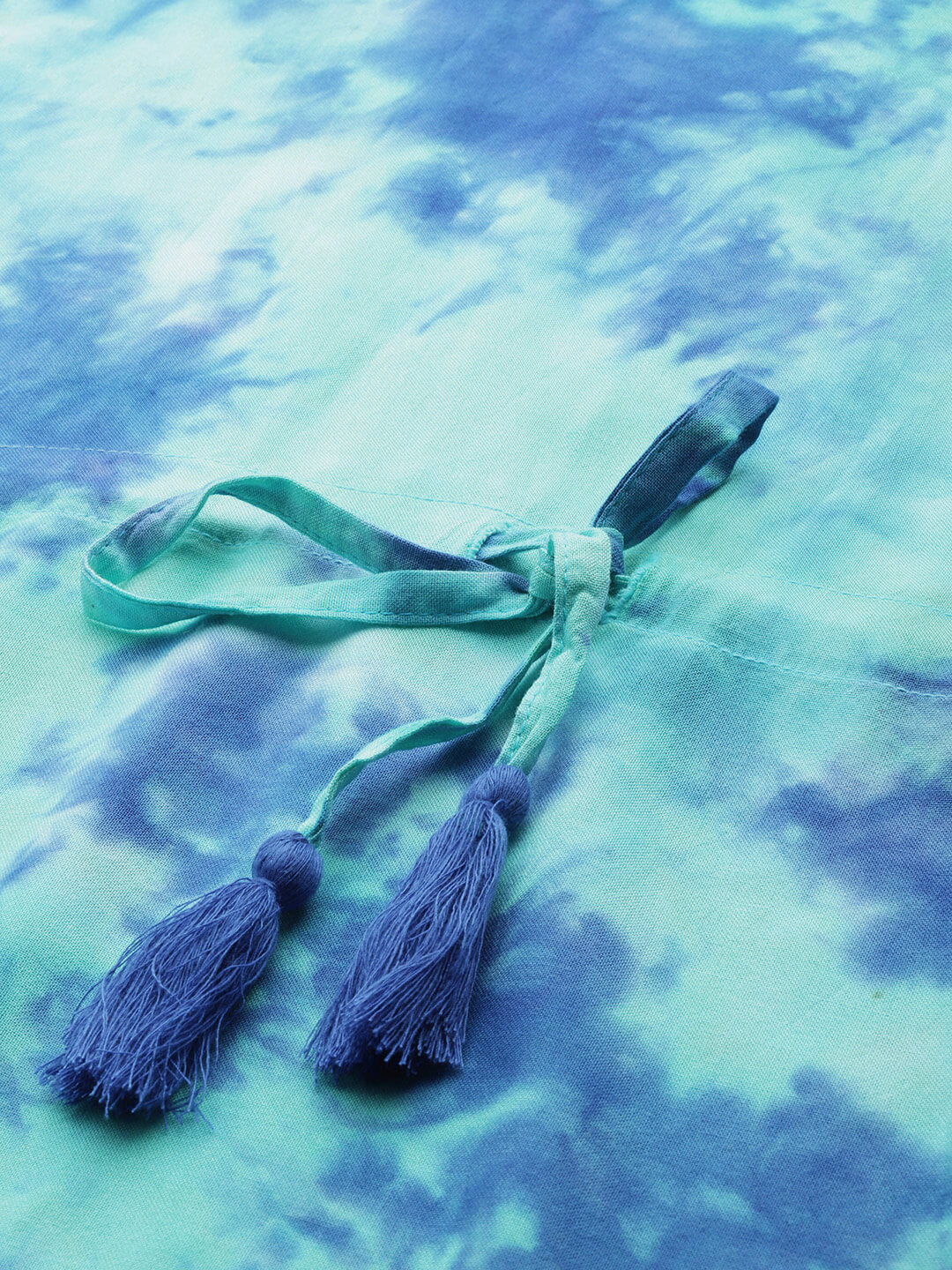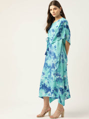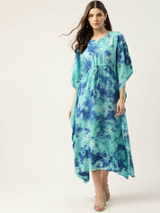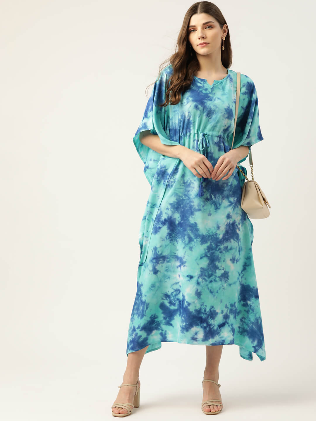 Make a name for yourself this season when you wear this Green Blue Hand Dyed Kaftan Dress. Create an absolute style high by going with this green-blue piece in combination with strappy heels and trendy bangles for a perfect brunch.