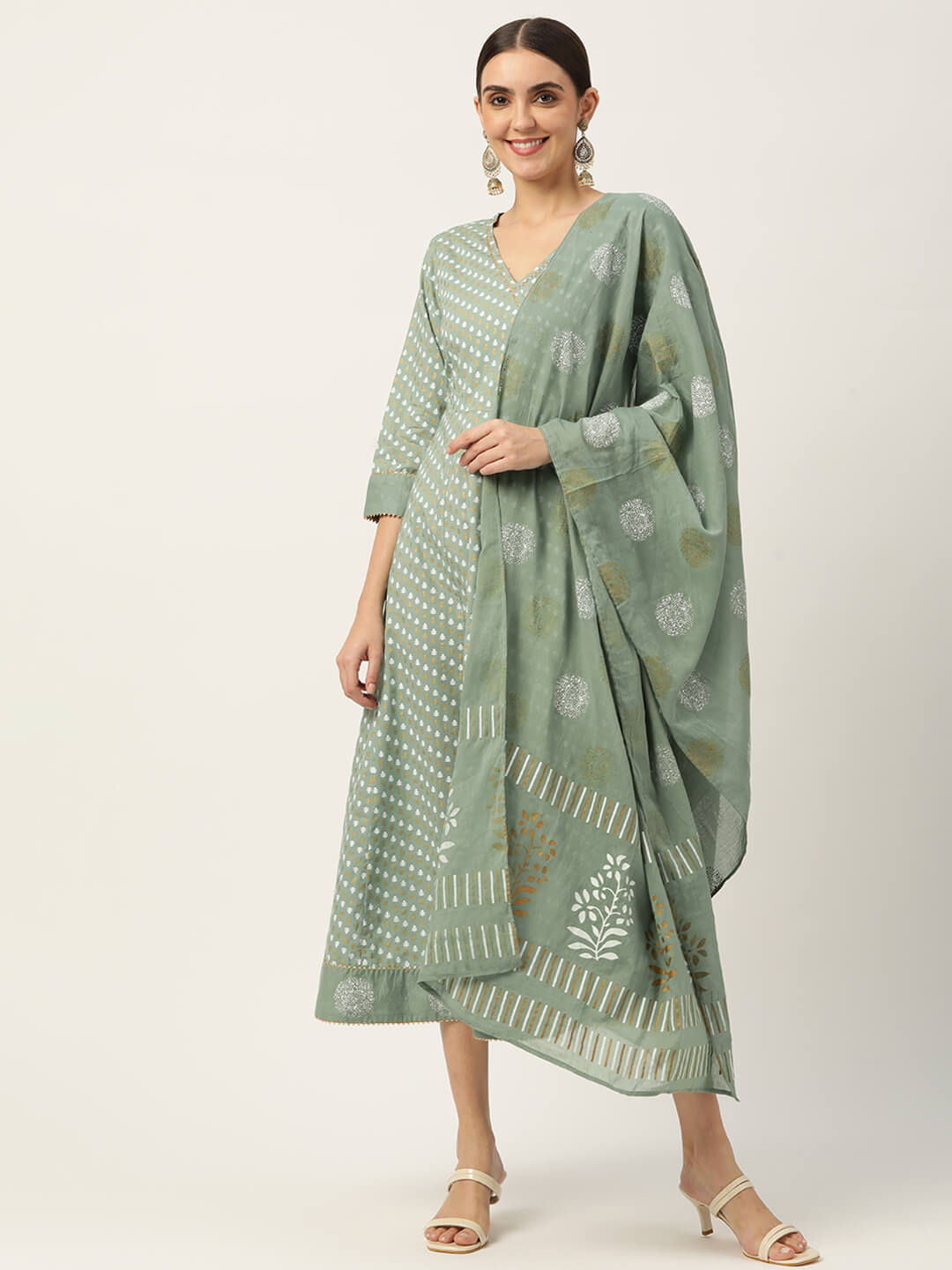 Pure Cotton White Printed Flared Kurta With Dupatta (W1262)