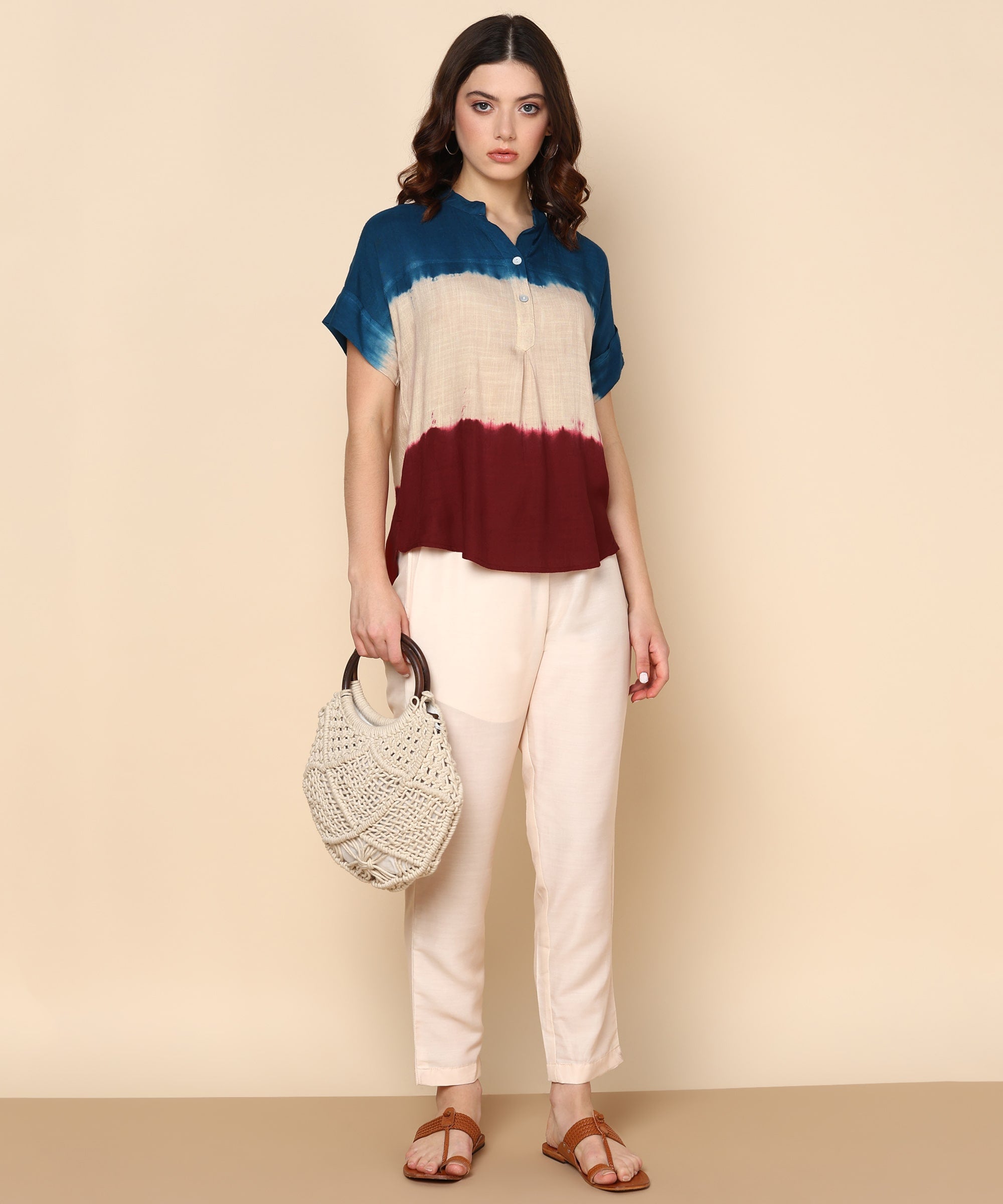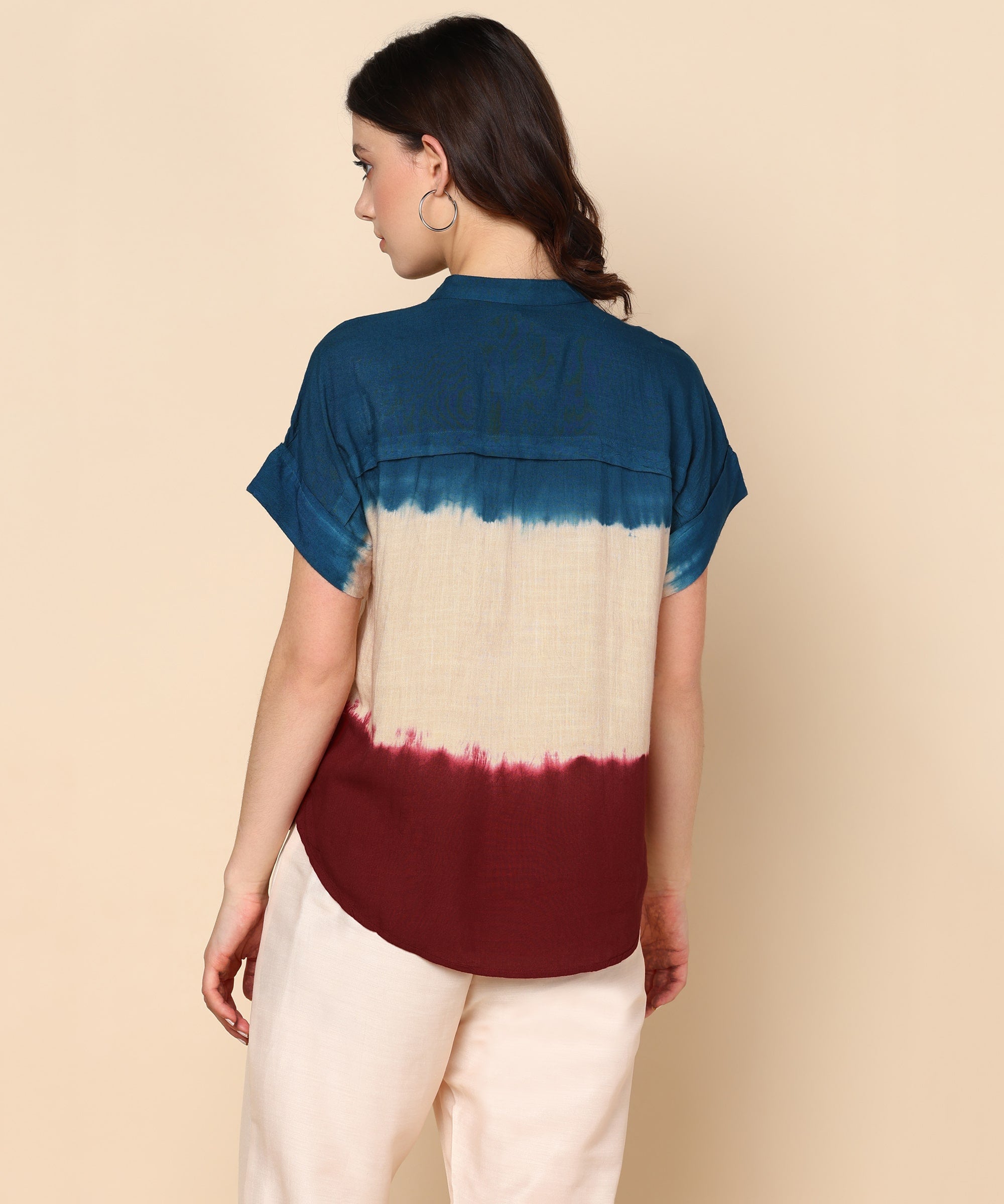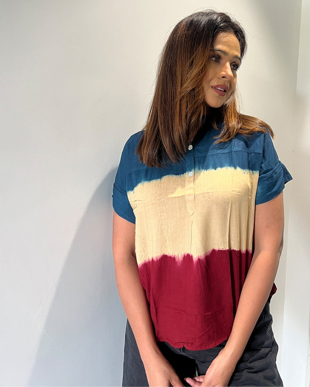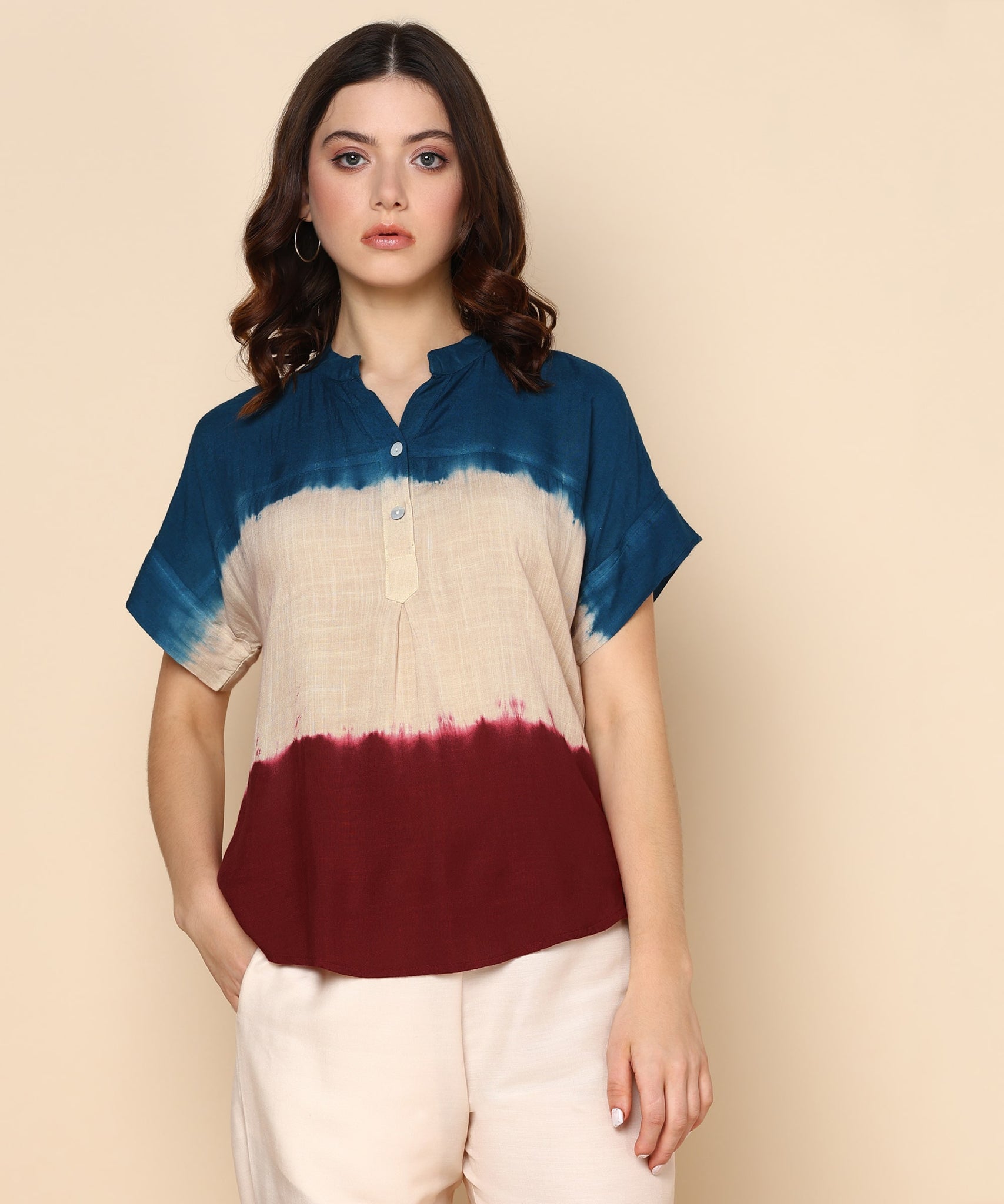 Introducing Our Tie-Dye Rayon Staple Top, a Vibrant and Unique Addition to Women's Clothing. Crafted from Soft, Luxurious Rayon Fabric, This Top Boasts a Captivating Tie-Dye Design That Is Further Enhanced by Charming Button Detailing, Making It a Truly Stylish Statement Piece.