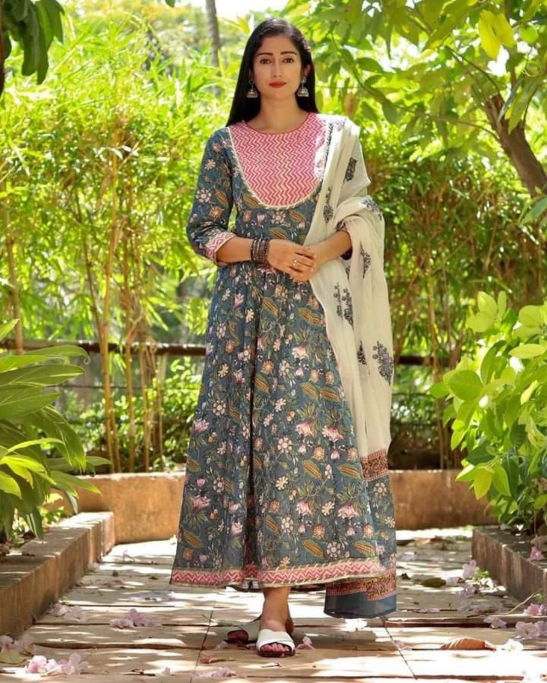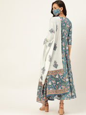 Pure Cotton Blue Flared Kurta With Dupatta (W1163)