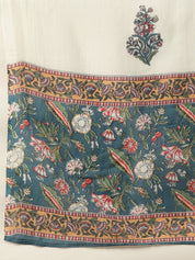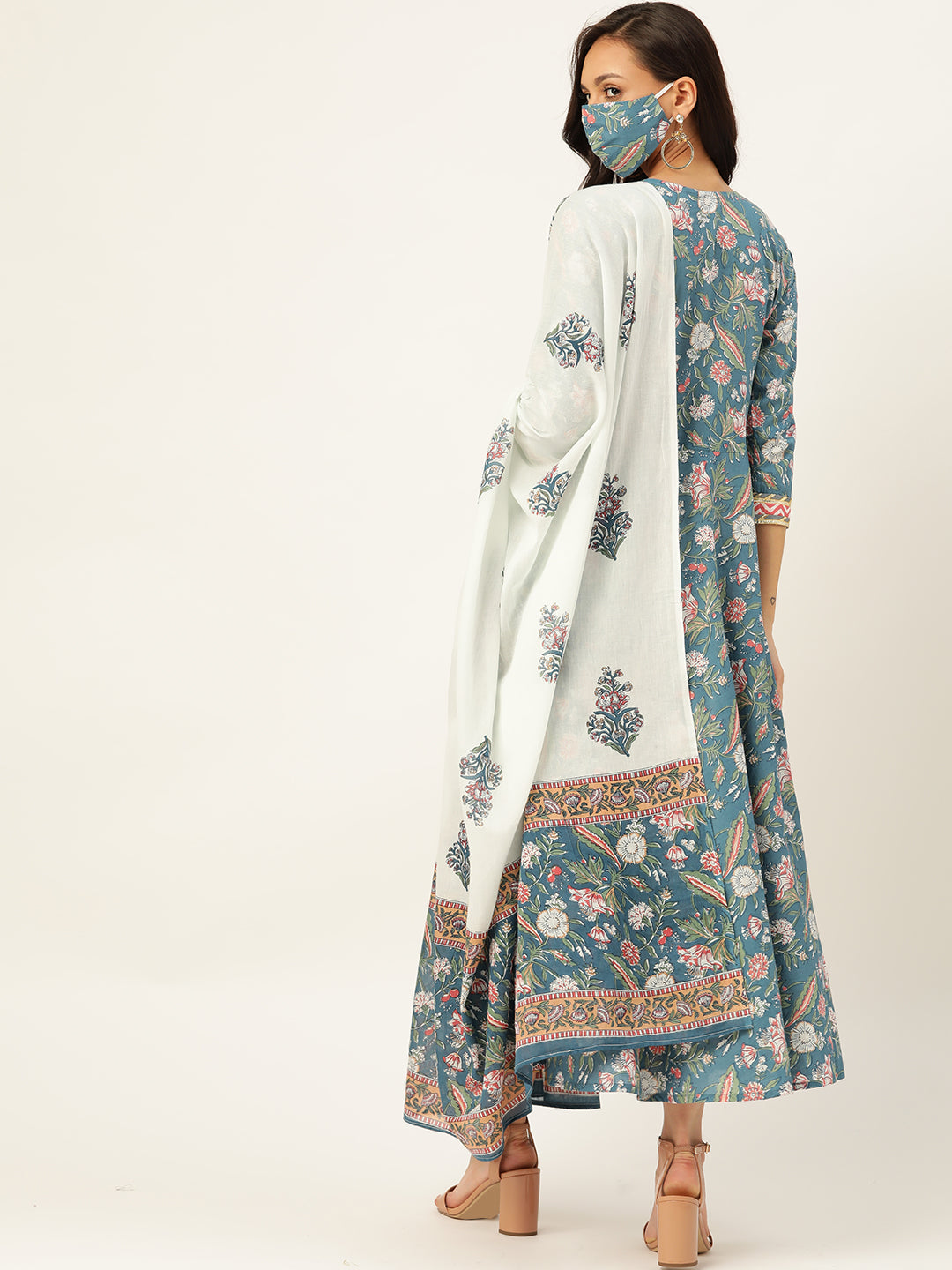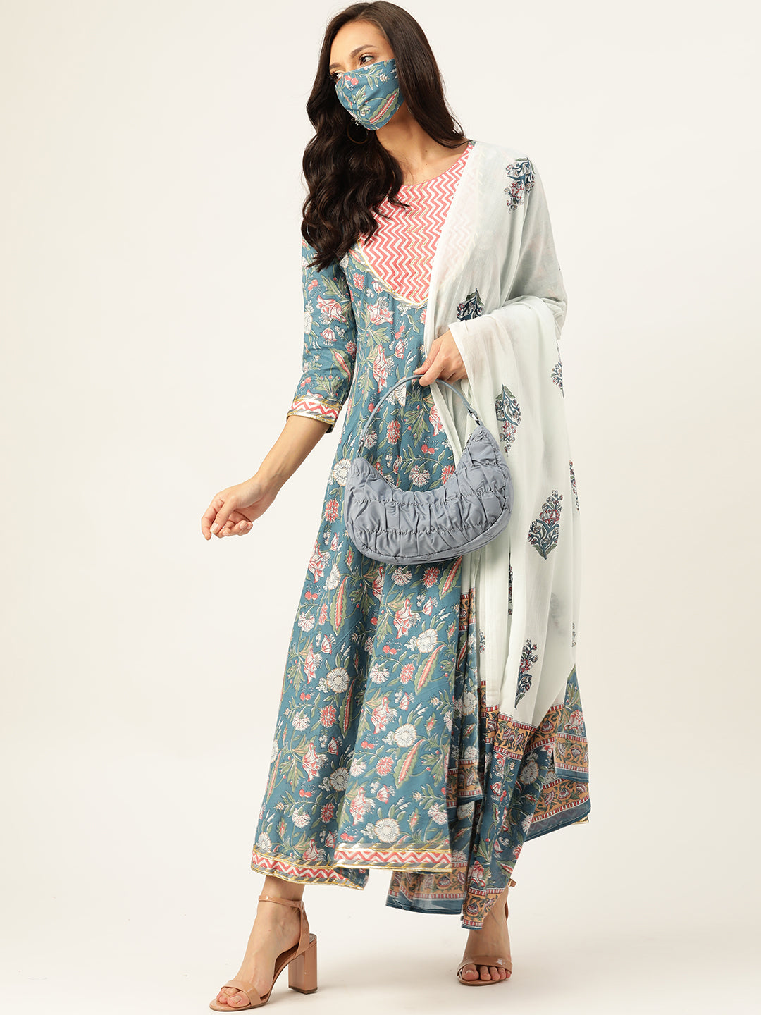 Imbue Regal Charm to Your Festive Wear by Picking This Blue Kurta Dupatta Set from Alila. Showcasing Floral Printing Detailing Running Down the Front of the Kurta, It Is Carved in a Flared Profile for Feminine Appeal.