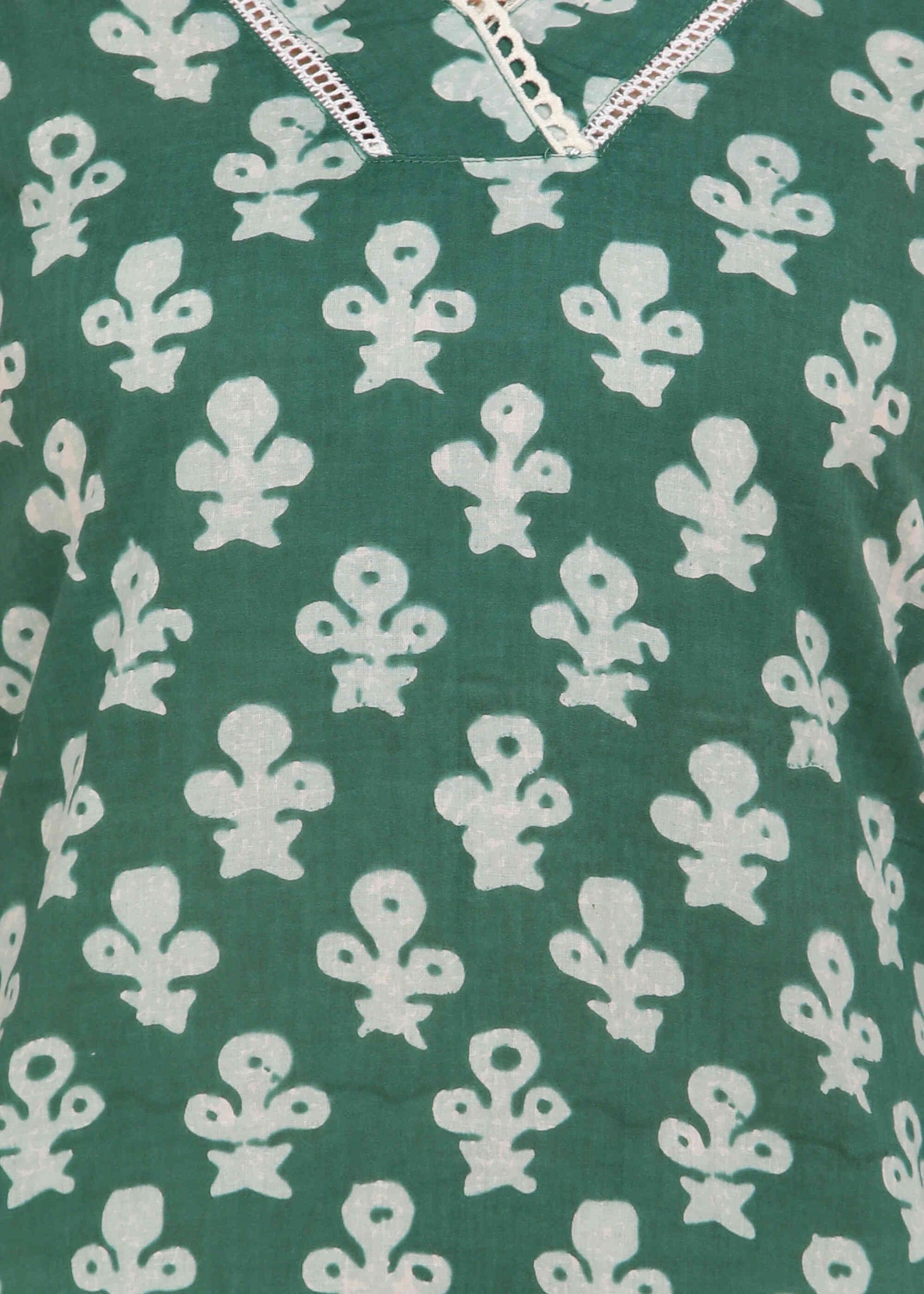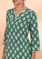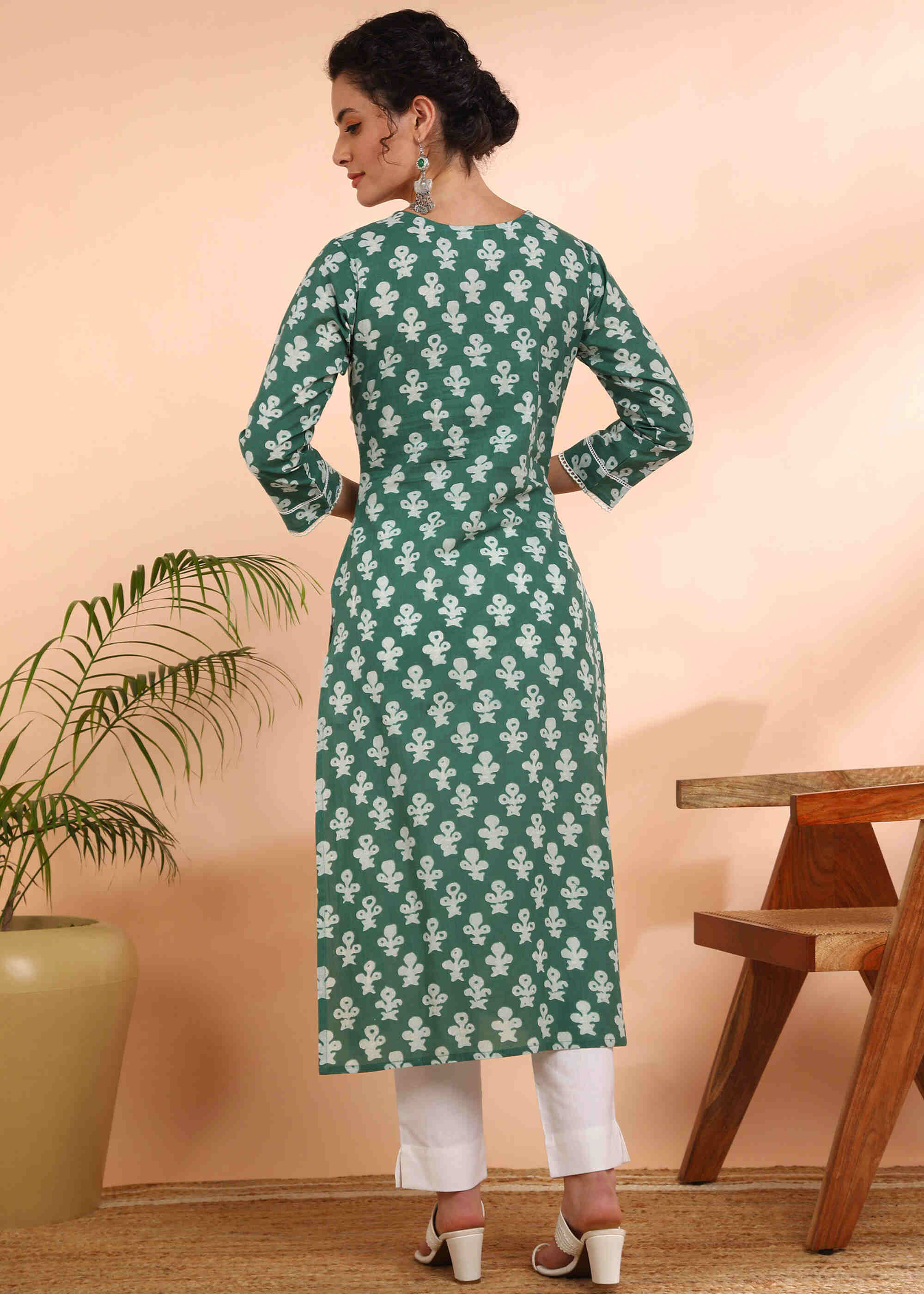Women Handmade Floral Pure Cotton Straight Green Kurta (W1575)