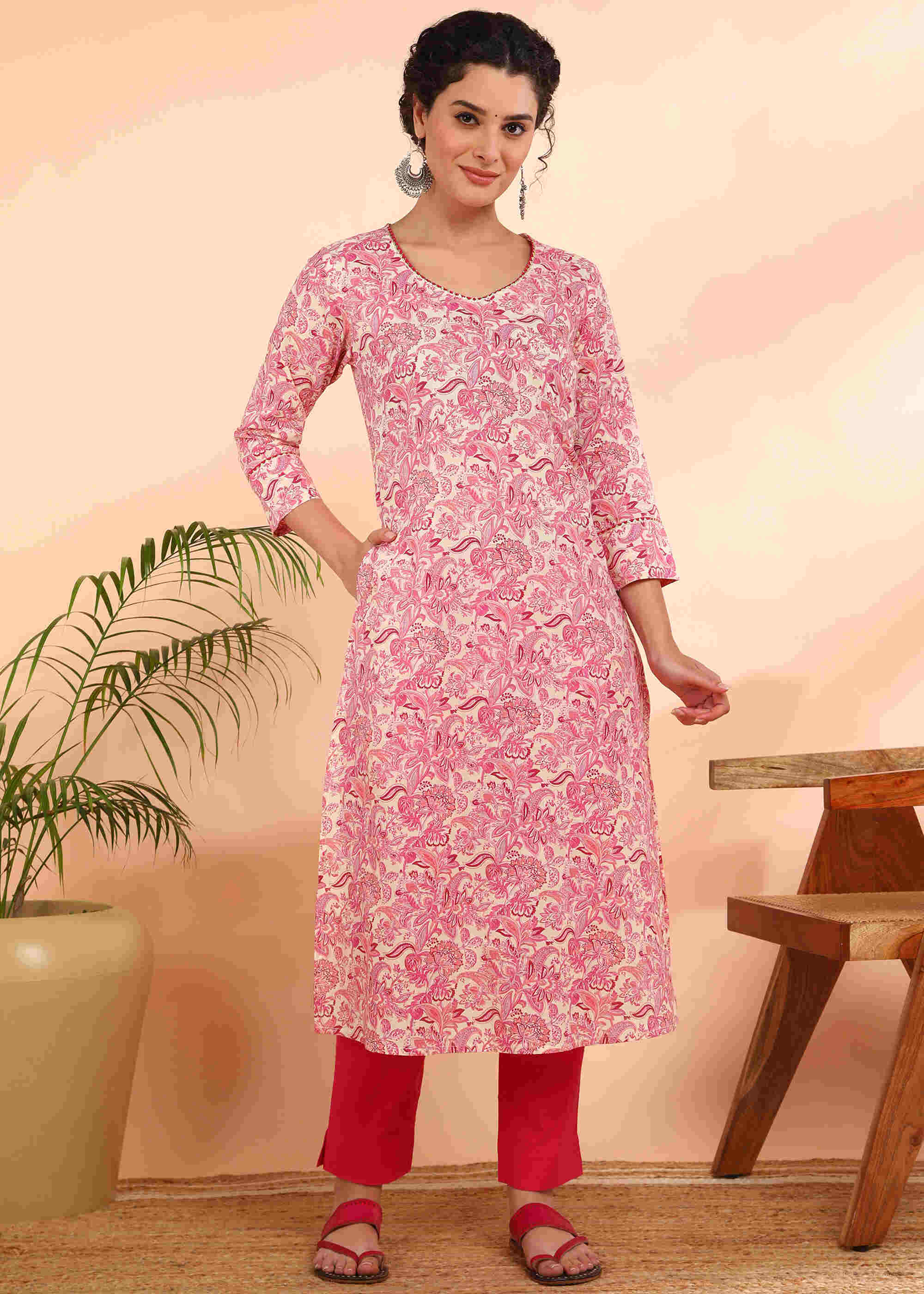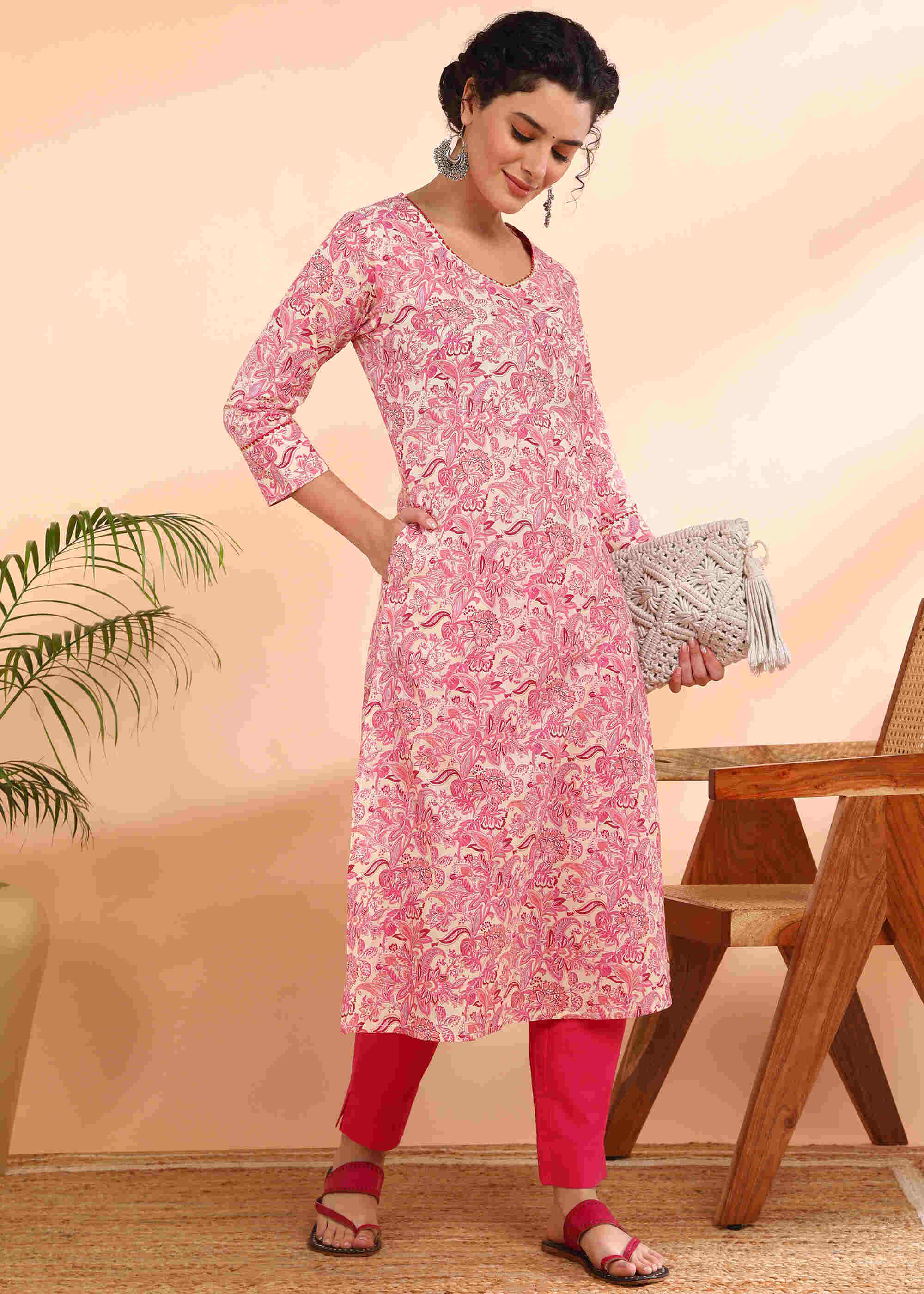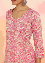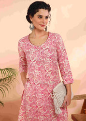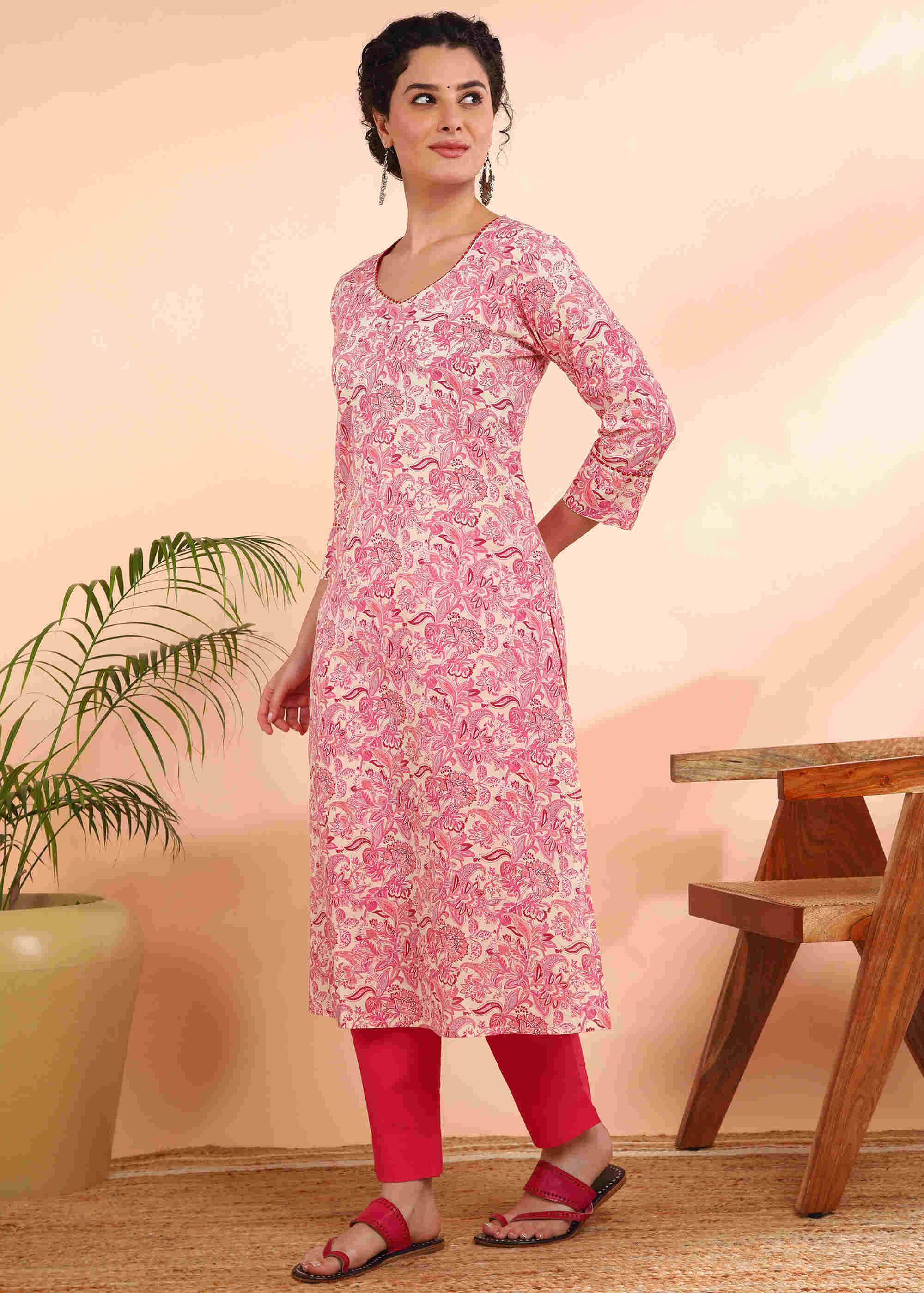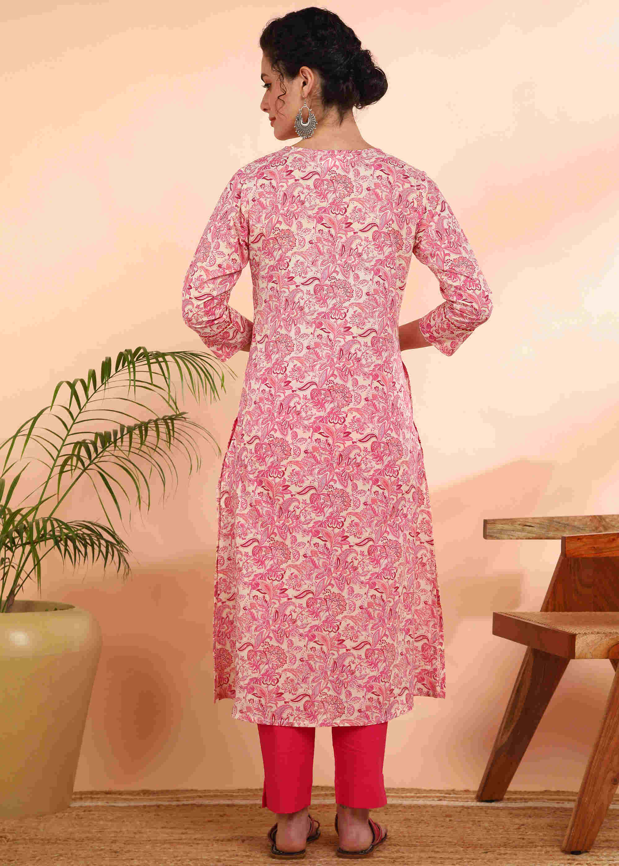 Elevate your everyday ethnic style with the Women Handmade Floral Pure Cotton Straight Pink Kurta. Crafted from 100% pure cotton, this kurta is soft, breathable, and perfect for all-day comfort. The elegant floral print adds a touch of sophistication, making it ideal for work, casual outings, or festive occasions.
