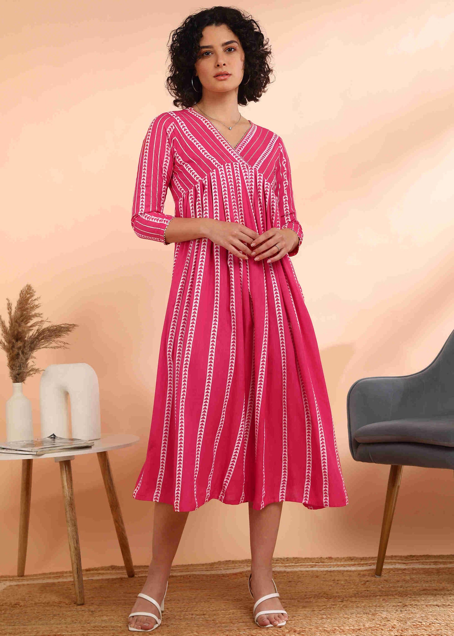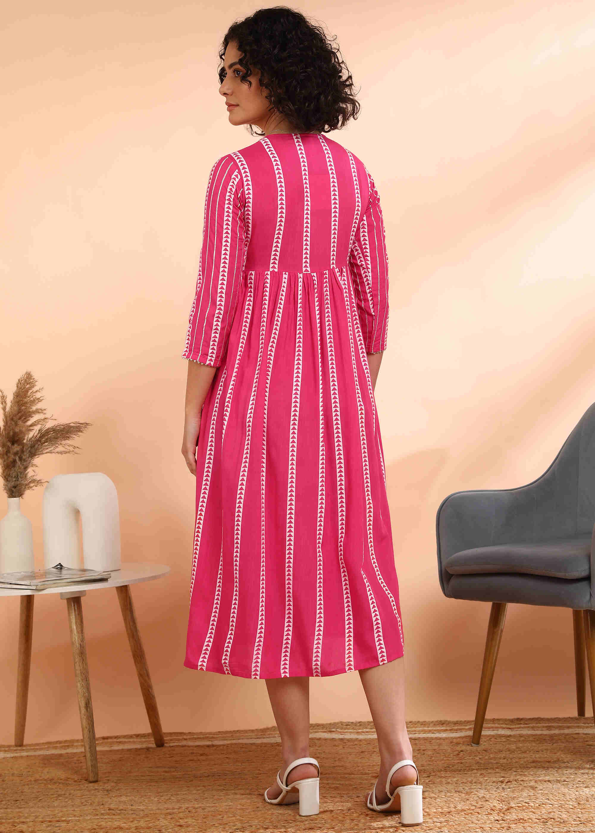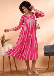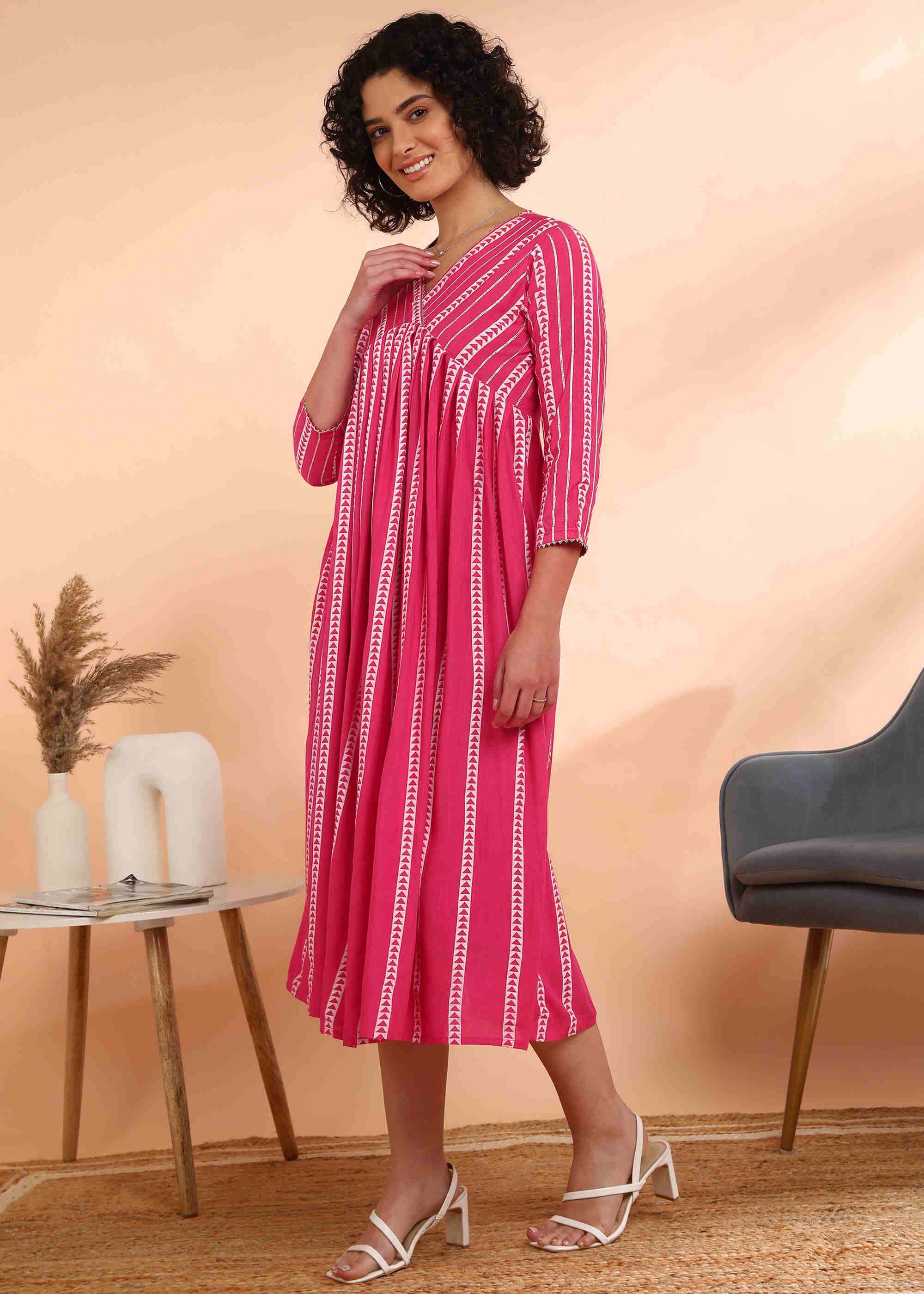 Women Handmade Striped Viscose Rayon Flared Pink Dress (W1587)