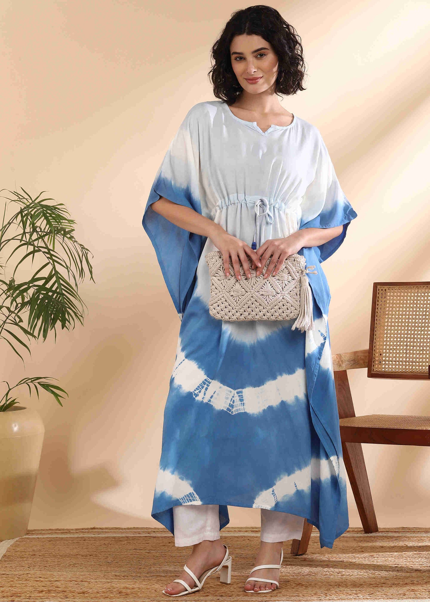 The Women Handmade Tie-Dye Rayon White Blue Kaftan Kurta in blue is a stylish and versatile addition to any wardrobe. Crafted from soft, breathable rayon, this lightweight Kaftan Kurta features a stunning tie-dye pattern in rich blue tones, offering a modern yet relaxed look. With its easy, relaxed fit, it's perfect for pairing with jeans, skirts, or shorts for a laid-back yet chic outfit. Ideal for everyday wear, this blue tie-dye Kaftan Kurta brings a fresh pop of color and effortless style to your casual wardrobe.