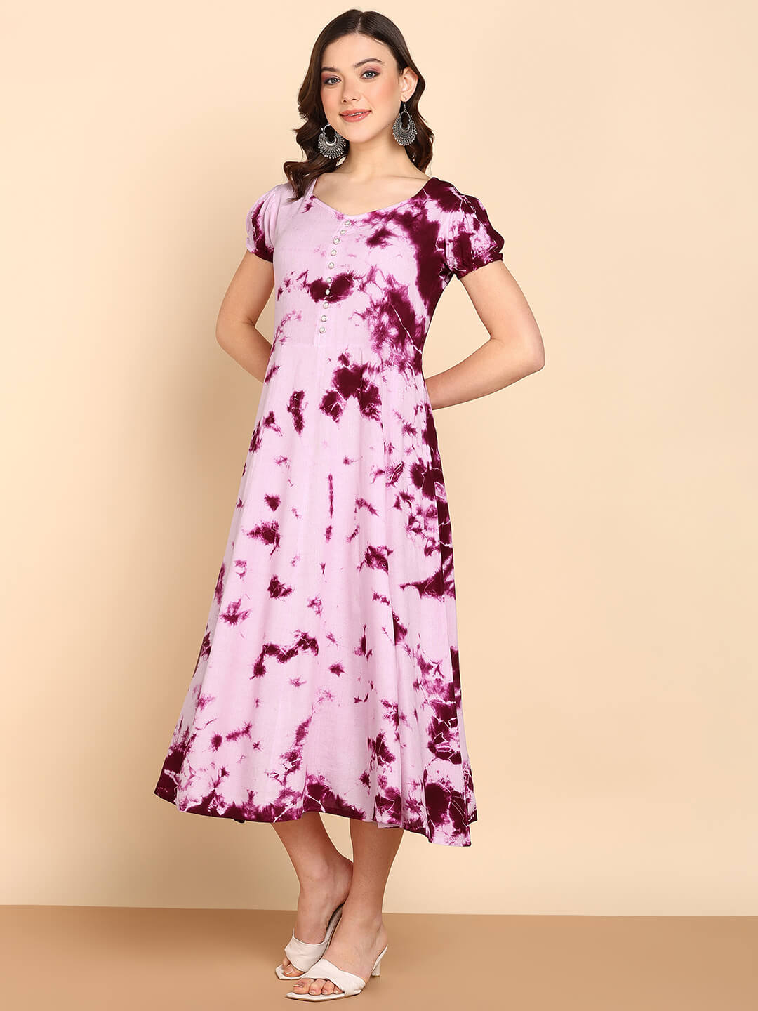- For a chic look, Pair the tie-dyed Jaipur Hues midi dress with white sneakers, a denim jacket, and hoop earrings for an effortlessly stylish casual look.